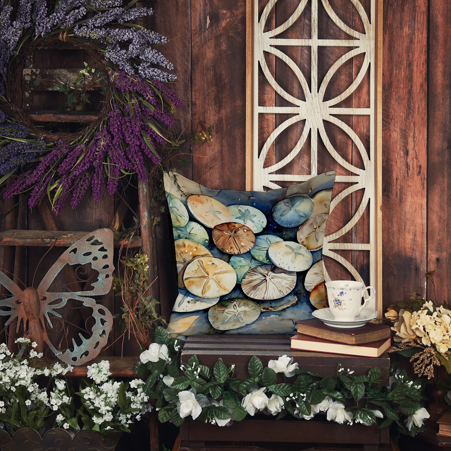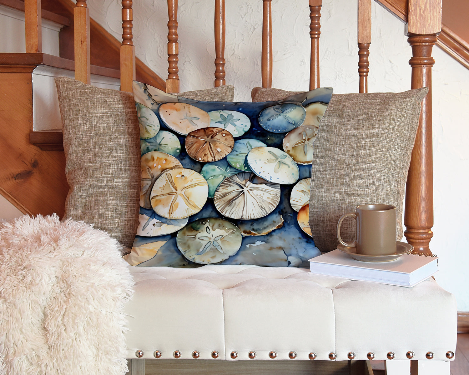 Throw Pillow featuring breed specific Sand Dollars artwork. Add a touch of vibrancy and comfort to your outdoor seating with Caroline's Treasures Fabric Decorative Pillow. Measuring approximately 14 inches by 14 inches, this outdoor pillow is crafted to elevate the appeal of your patio furniture, infusing it with vivid color and artistic flair. The pillow includes a 100% Polyester Fabric sham filled with a quality pillow form to provide superior comfort. Innovatively made from our brand new material, specifically woven for its water resistance, this pillow is designed for durability. The soft canvas fabric offers versatility in use, fit for your indoor couch or your outdoor patio, porch, or veranda. The fabric is dyed with colorfast dyes built for resilience against weather conditions, ensuring the pillow retains its beauty over time. Constructed by sewing three fabric pieces to create a sham, the polyester insert is then nestled inside to form the pillow, resulting in an overstuffed pillow that maintains its shape. Both the sham and the pillow insert are proudly made in the United States. As the pillows are handcrafted, there may be minor variations in size, further enhancing their unique charm. Experience comfort in style with Caroline's Treasures Fabric Decorative Pillow.