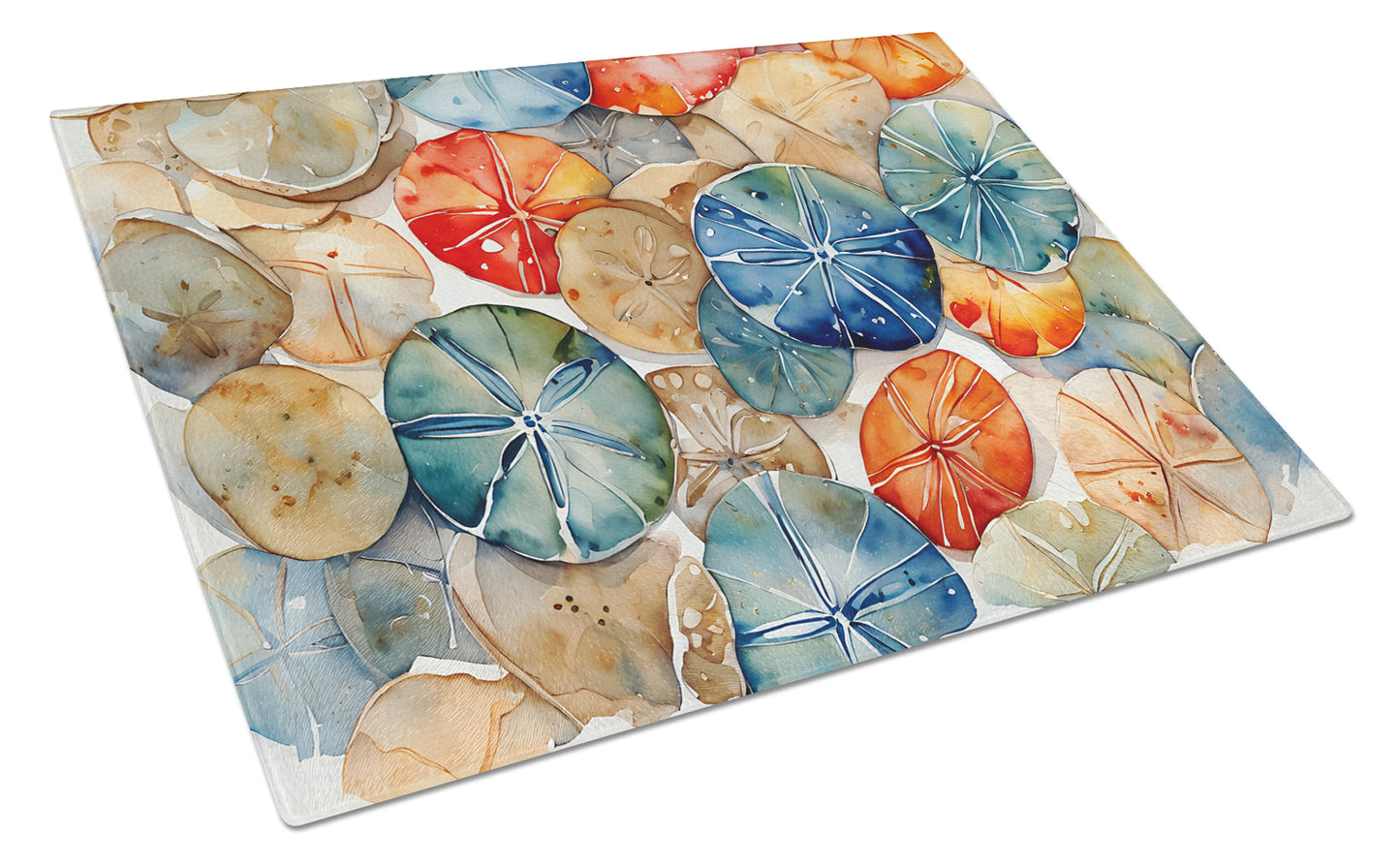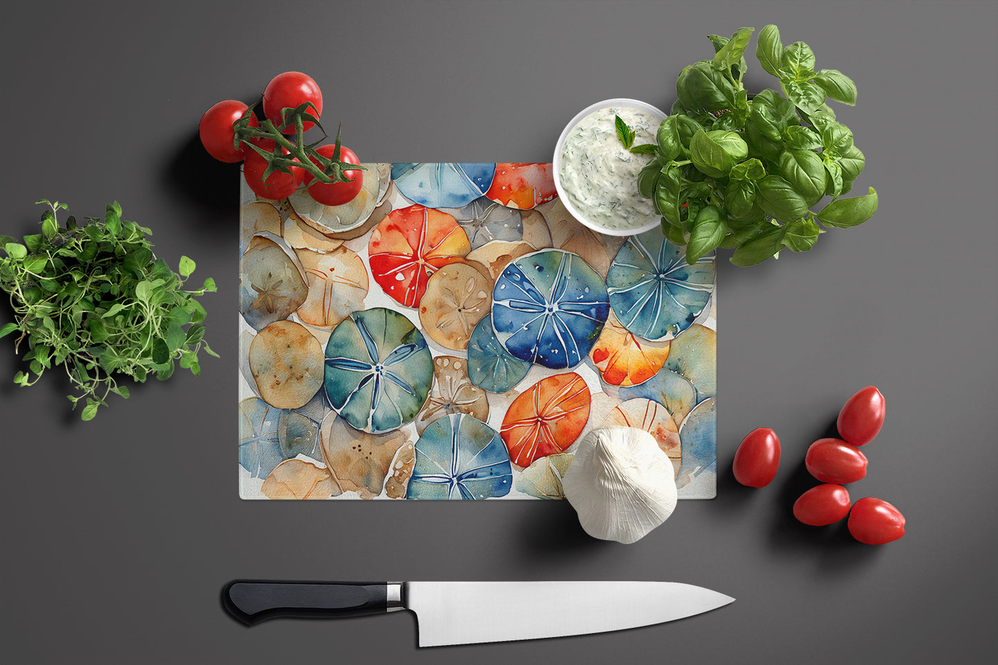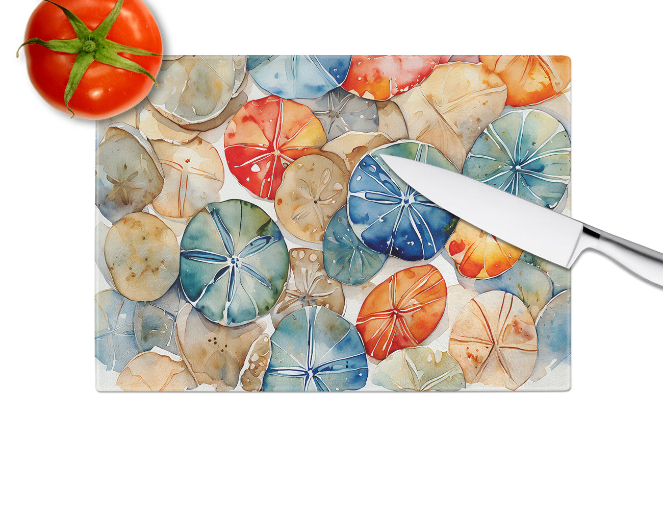 Glass Cutting Board featuring breed specific Sand Dollars artwork. Introduce your kitchen to the vibrant, large Decorative Glass Cutting Board from Caroline's Treasures. Crafted from resilient tempered glass, this board is not only a utilitarian necessity but also a colorful art piece. With its generous dimensions of 15 inches in height and 12 inches in length, it offers ample space for all your cutting needs. Every piece showcases captivating artwork from distinguished artists, bringing an aesthetic edge to your kitchen. Beyond its attractive design, this cutting board ensures your countertop stays pristine and unscathed, owing to its heat-resistant properties. Engineered with user convenience in mind, it features non-skid feet for stability, and rounded corners for additional safety. Its robust construction renders it virtually unbreakable, guaranteeing longevity. The board comes with protective feet bumpers, maintaining its position during use. This product is recommended to be hand washed only. Proudly printed and assembled in the United States, this cutting board exemplifies superior craftsmanship. With Caroline's Treasures' Decorative Glass Cutting Board, you're investing in a blend of functionality and artistic flair.