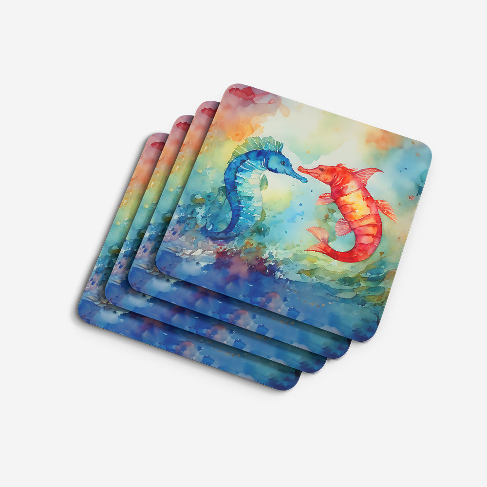 Foam Coasters featuring breed specific Seahorses artwork. Presenting our Set of 4 Foam Coasters, a stylish and practical addition to your table setting. Each square coaster, measuring 3 1/2 inches by 3 1/2 inches, is perfectly sized to accommodate various drinkware, from coffee mugs to tumblers. These coasters stand out with their full-color artwork, permanently dyed onto the material for a vibrant and fade-resistant finish. They're not just functional, they're a fashionable statement, adding a touch of flair to any gathering or event. Our foam coasters serve a dual purpose - they protect your table from water stains and are perfect for both hot and cold drinks. The material used is similar to that of our high-quality mouse pads, ensuring durability and heat resistance. These coasters are easy to maintain - simply wash them in the top of your dishwasher and lay flat to dry. The design won't come off, ensuring they retain their vivid colors for years. Pair them with one of our insulated coolers or huggers for a cohesive, thoughtful gift set. Enhance your beverage experience with our Set of 4 Foam Coasters.