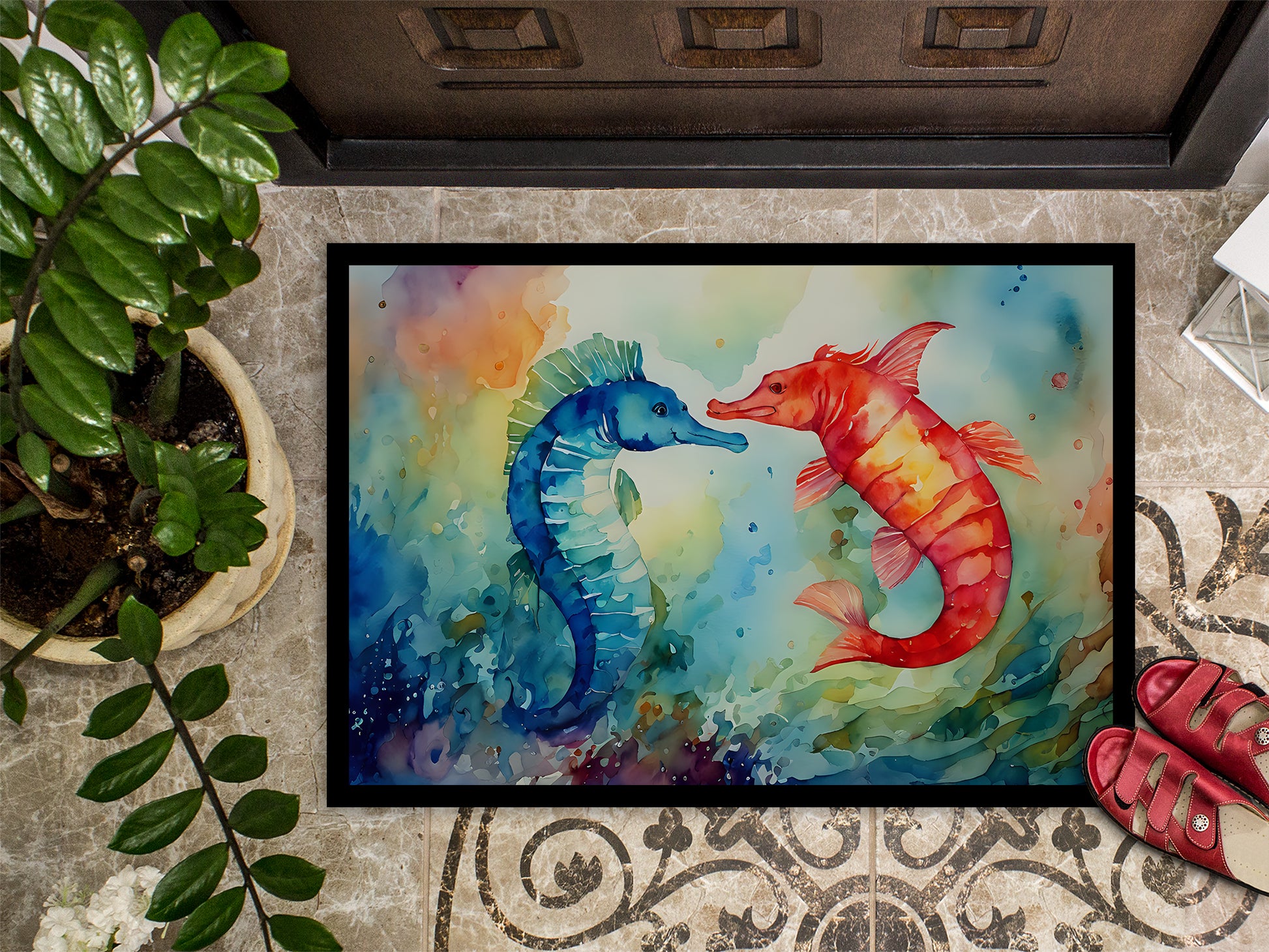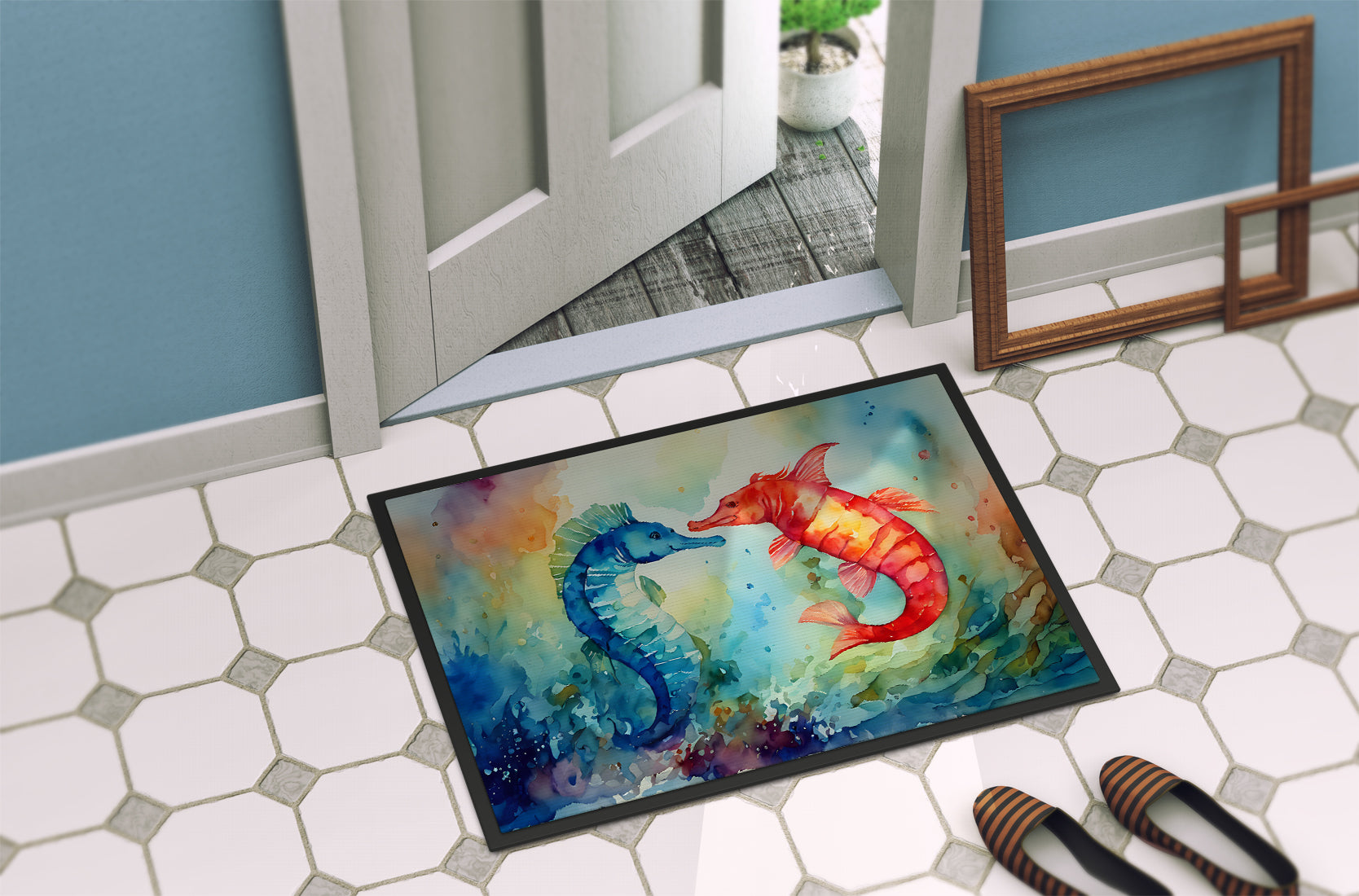 Doormat featuring breed specific Seahorses artwork. Welcome your guests in style with our Artwork Door Mat, designed to withstand almost any weather condition. This mat, measuring approximately 18 by 27 inches, is held together by durable black binding tape. Its top layer, composed of polyester felt, is dyed with the eye-catching image you see on the mat. A few layers below provide the mat with stability, while its rubber bottom is stamped to help prevent slipping and ensures safety. Our mat works wonderfully as both an indoor or outdoor door mat. For cleaning, simply hose it off with water or use a power washer - no need for any cleaner that produces suds. Avoid scrubbing with a brush, instead, opt for the vacuum on floor setting. Designed manufactured and printed in the USA, this mat is a perfect addition to your porch, outdoor kitchen, entryway, or any indoor space. Its unique design makes it a charming decorative rug that greets your guests and adds a stylish touch to your home decor.