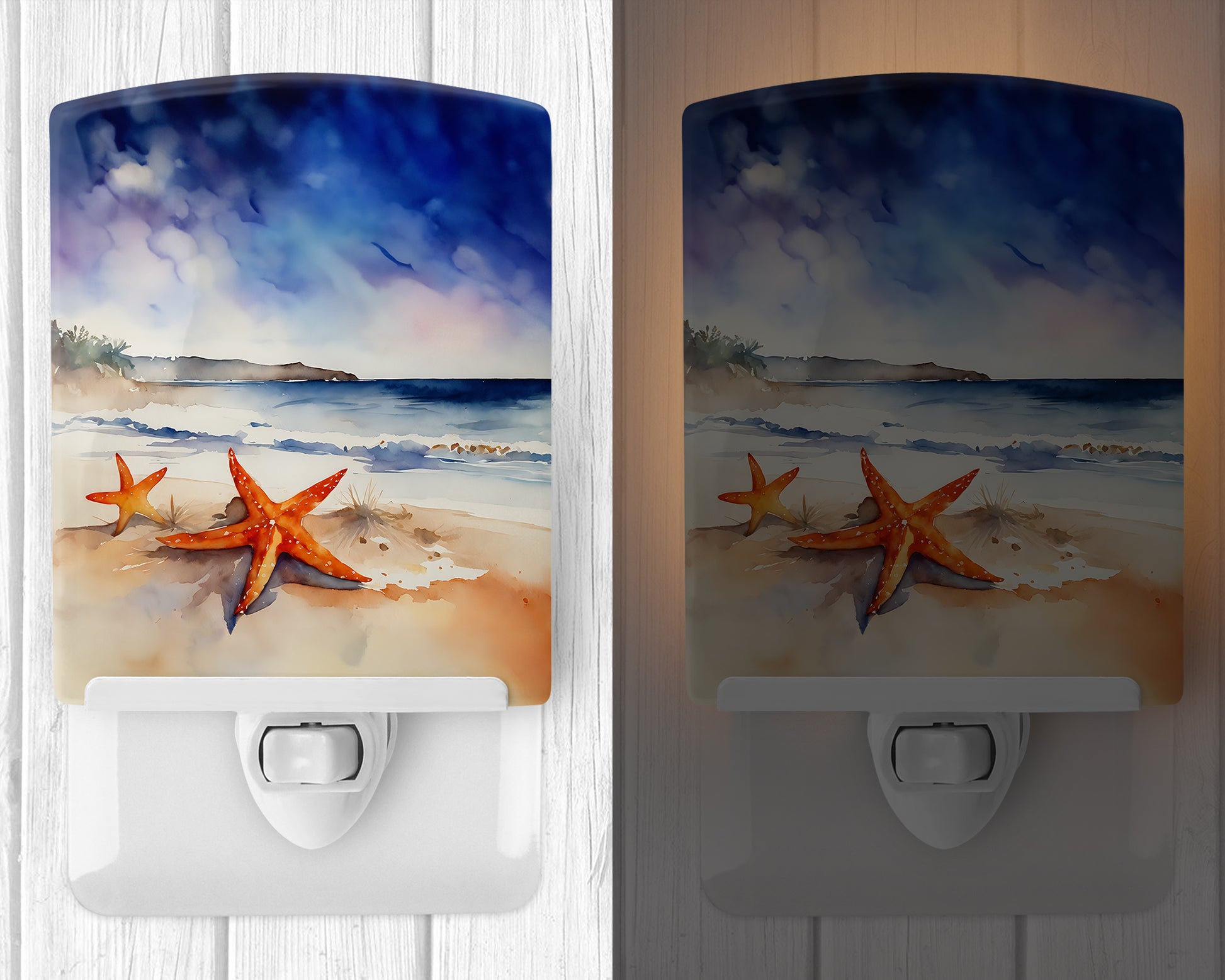 Ceramic Night Light featuring breed specific Starfish artwork. Introduce a splash of artistic flair and subtle illumination to your space with the Decorative Ceramic Night Light from Caroline's Treasures. Perfect for any room, this night light seamlessly blends functionality with an aesthetic appeal, offering a stylish solution to brighten up dark corners of your home or office. Boasting a six-inch high by four-inch wide ceramic tile at the front, it showcases vivid, full-color artwork from distinguished artists, transforming a simple utility into a vibrant art piece. The artwork is securely encased in a robust metal holder, ensuring durability and longevity. Two screws are provided to firmly affix the tile into the holder. The holder extends three inches deep, housing an included bulb that emits a soft, welcoming glow. This product meets all safety standards, as evidenced by its UL approval. Proudly made in the United States from imported components, this Decorative Ceramic Night Light is not just a functional device; it's a statement piece that enhances the ambiance of your surroundings.