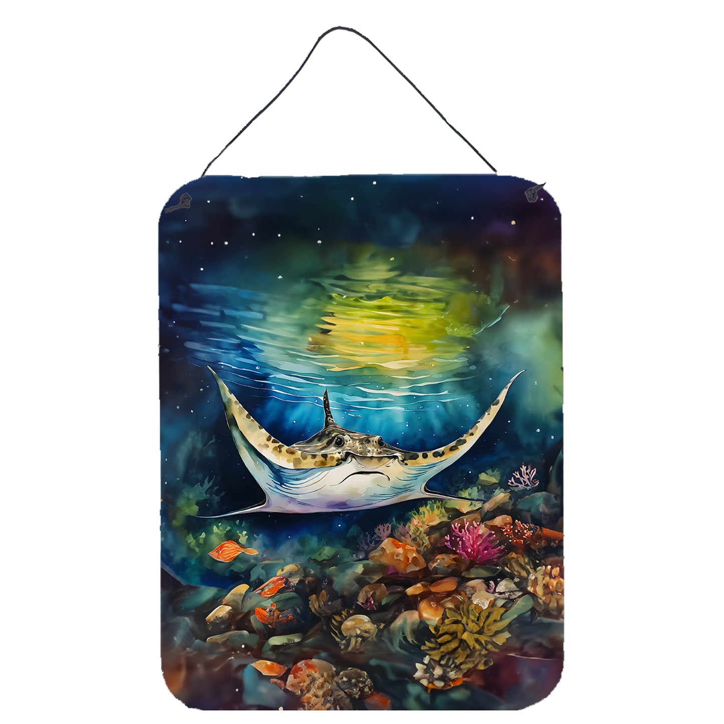 Wall or Door Hanging Prints featuring breed specific Sting Ray artwork. Spruce up your space with our Indoor or Outdoor Aluminum Artwork Prints. Designed to brighten your kitchen, bathroom, office, or outdoor areas like patios and porches, these prints offer a unique way to decorate your home or workspace. Measuring 12 by 16 inches, the prints are vibrant, full color, and bring an element of artistry to any setting. What makes these prints special is their durability and resistance to the elements. If placed outside, they can withstand direct sunlight for a considerable time before showing signs of fading. Crafted from rust and fade-resistant aluminum, these prints are built to last and maintain their vibrant colors. Each print comes with a black hanging rope and rounded corners for safety. The back of the print showcases a brushed silver color, adding a touch of sophistication. The lightweight design allows easy hanging with virtually any nail or screw, making installation a breeze. Whether indoors or outdoors, these prints add a distinctive touch to any space.