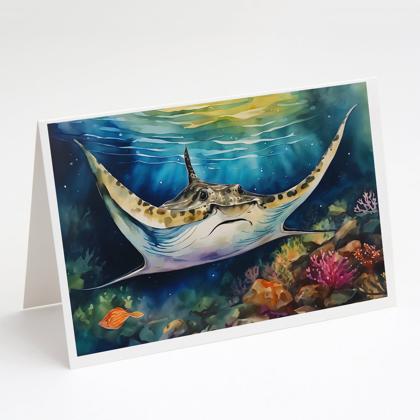 Greeting Cards Pack of 8 featuring breed specific Sting Ray artwork. Celebrate special moments with Caroline's Treasures Printed Greeting Card Pack. This pack includes eight beautifully folded 5x7 cards, accompanied by eight matching white envelopes. With blank interiors, these cards provide ample space for your personalized messages and heartfelt holiday greetings. Each card features captivating full-color artwork, meticulously printed in our facility on high-quality 80 lb cover stock or 216 GSM. The super smooth finish of the white cards enhances the visual impact of the artwork, creating a truly stunning presentation. Designed by our talented in-house artists or licensed artists, the artwork on these cards showcases their creativity and attention to detail. From vibrant illustrations to captivating designs, each card tells its own unique story. Whether it's for birthdays, anniversaries, holidays, or any special occasion, Caroline's Treasures Greeting Card Pack is the perfect way to convey your heartfelt sentiments. Share joy, love, and warm wishes with these exquisite cards and make every moment unforgettable.