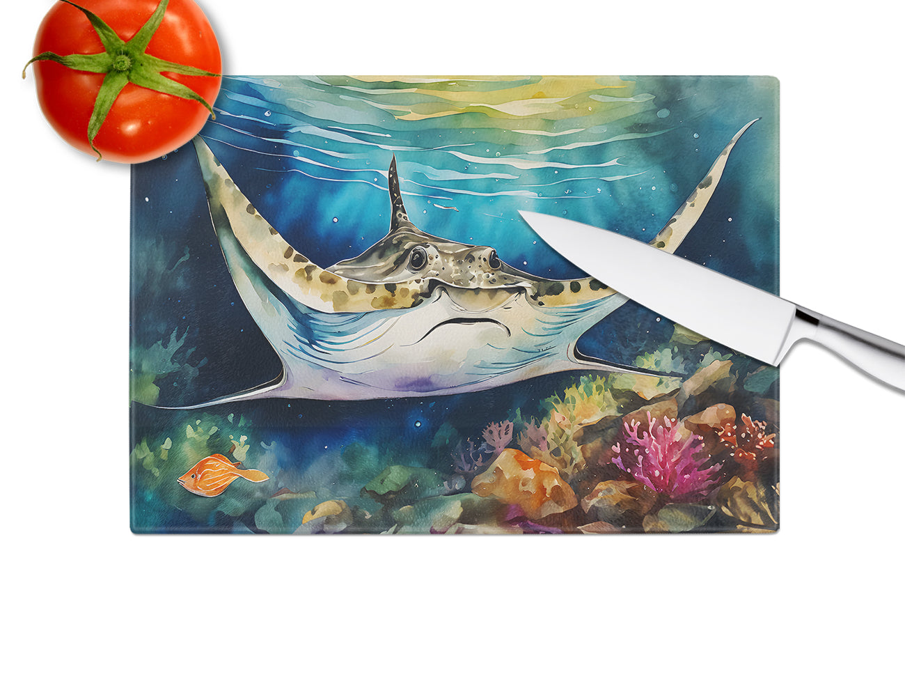 Glass Cutting Board featuring breed specific Sting Ray artwork. Introduce your kitchen to the vibrant, large Decorative Glass Cutting Board from Caroline's Treasures. Crafted from resilient tempered glass, this board is not only a utilitarian necessity but also a colorful art piece. With its generous dimensions of 15 inches in height and 12 inches in length, it offers ample space for all your cutting needs. Every piece showcases captivating artwork from distinguished artists, bringing an aesthetic edge to your kitchen. Beyond its attractive design, this cutting board ensures your countertop stays pristine and unscathed, owing to its heat-resistant properties. Engineered with user convenience in mind, it features non-skid feet for stability, and rounded corners for additional safety. Its robust construction renders it virtually unbreakable, guaranteeing longevity. The board comes with protective feet bumpers, maintaining its position during use. This product is recommended to be hand washed only. Proudly printed and assembled in the United States, this cutting board exemplifies superior craftsmanship. With Caroline's Treasures' Decorative Glass Cutting Board, you're investing in a blend of functionality and artistic flair.