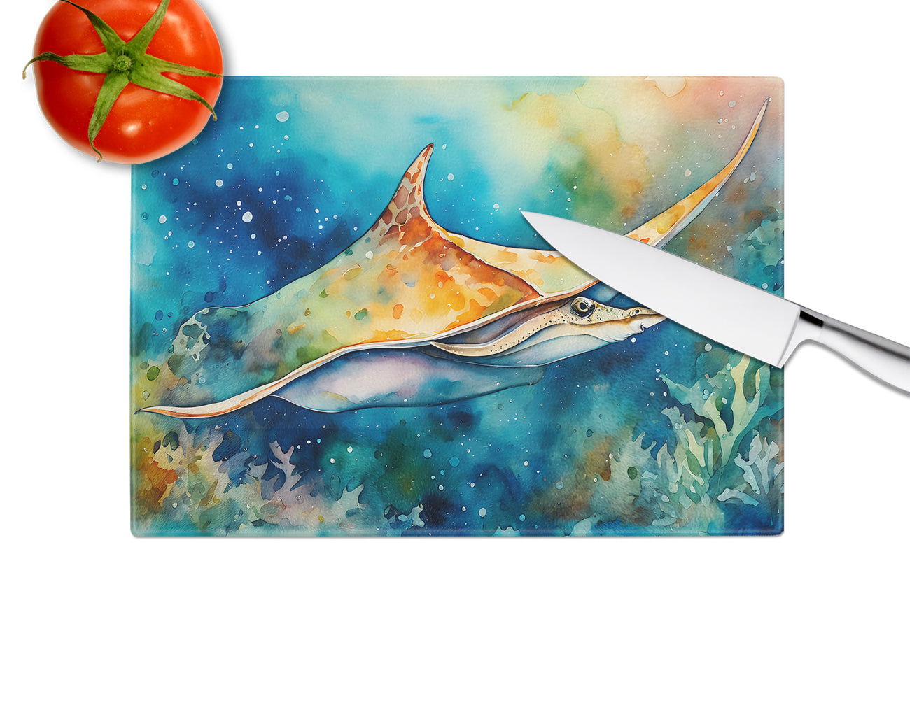 Glass Cutting Board featuring breed specific Sting Ray artwork. Introduce your kitchen to the vibrant, large Decorative Glass Cutting Board from Caroline's Treasures. Crafted from resilient tempered glass, this board is not only a utilitarian necessity but also a colorful art piece. With its generous dimensions of 15 inches in height and 12 inches in length, it offers ample space for all your cutting needs. Every piece showcases captivating artwork from distinguished artists, bringing an aesthetic edge to your kitchen. Beyond its attractive design, this cutting board ensures your countertop stays pristine and unscathed, owing to its heat-resistant properties. Engineered with user convenience in mind, it features non-skid feet for stability, and rounded corners for additional safety. Its robust construction renders it virtually unbreakable, guaranteeing longevity. The board comes with protective feet bumpers, maintaining its position during use. This product is recommended to be hand washed only. Proudly printed and assembled in the United States, this cutting board exemplifies superior craftsmanship. With Caroline's Treasures' Decorative Glass Cutting Board, you're investing in a blend of functionality and artistic flair.