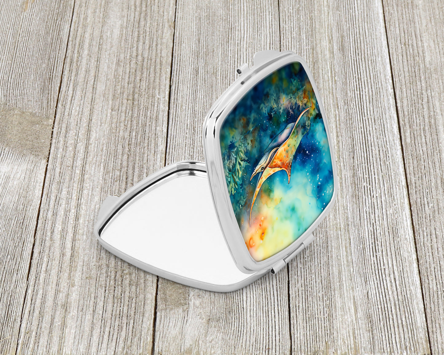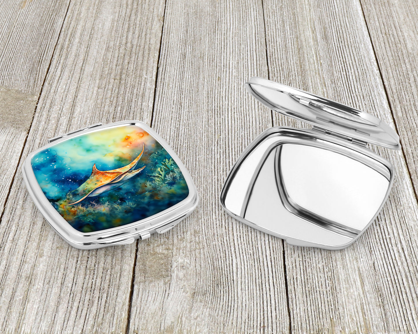 Compact Mirror featuring breed specific Sting Ray artwork. Introducing our Square Compact Mirror, a blend of elegance, functionality, and compactness, perfect for on-the-go touch-ups. This Silvertone metal mirror, with dimensions of 2.75 inches x 3 inches x .3 inches, fits effortlessly into your purse, handbag, or pocket, ensuring that you can check your appearance anytime, anywhere. Our compact mirror stands out with its eye-catching artwork on the front, adding a dash of style to this practical accessory. It is more than just a mirror; it's a statement piece that reflects your personality and aesthetic. When opened, this compact reveals two mirrors inside, doubling your perspective for precise touch-ups. The Silvertone metal construction ensures durability while maintaining a lightweight feel, making it an ideal everyday carry item. Whether you're rushing to a meeting, prepping for a dinner date, or just need a quick check on your look, our Square Compact Mirror is your reliable companion. Experience the perfect blend of style and practicality with this must-have accessory.