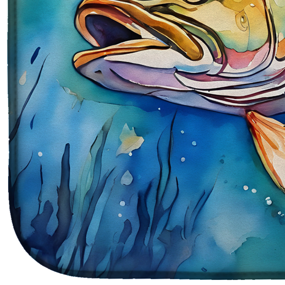 Dish Drying Mat featuring breed specific Striped Bass artwork. Say goodbye to messy countertops and soggy dish towels with our innovative dish drying mat. Our high-quality dish drying pad is designed to keep your countertops dry while offering a stylish and efficient solution. Whether you're air drying dishes, glasses, stemware, silverware, pots, pans, bottles, or even fruits and vegetables, our dish mat is the perfect choice. The 14 inches x 22 inches size fits most counters and dish drying racks, and the non-slip design ensures stability. Made with water-absorbent polyester and a polyurethane foam insert, our dish drying mat is not only functional but also durable. It's machine washable and printed in the USA for long-lasting use. The beautiful artwork adds flair to your kitchen decor, making it a perfect housewarming gift or present for any occasion. Upgrade your kitchen experience with our absorbent and versatile dish drying mat.