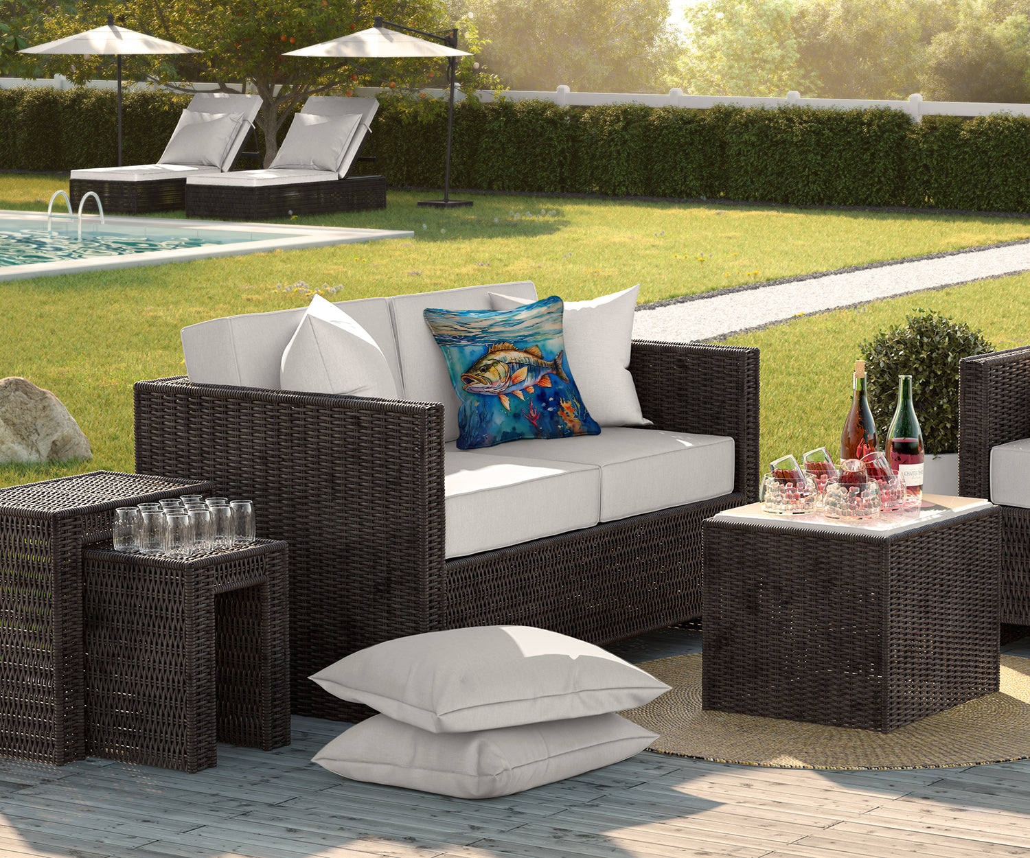 Throw Pillow featuring breed specific Striped Bass artwork. Revitalize your outdoor or indoor living space with Caroline's Treasures 18x18 Fabric Decorative Pillow. With a generously sized dimension of approximately 18 inches by 18 inches, this pillow makes a comfortable and aesthetic addition to any seating area. Made from a unique, water-resistant material developed by Caroline's Treasures, the pillow sham is 100% polyester fabric that's durable and ready to weather any condition. Its vibrant, full-color artwork will not fade over time as it is dyed with color-fast dyes. Whether you place it on your patio furniture, porch, veranda, or indoor couch, its soft canvas fabric ensures a cozy experience. The pillow is handcrafted in the United States, featuring a sham created from three pieces of fabric and a polyester insert for enduring shape and overstuffed comfort. Despite being robustly built to endure the outdoors, it is as soft and snug as your favorite indoor cushions. Please note, as all our pillows are handmade, sizes may vary slightly, adding to the charm of this unique decorative item.