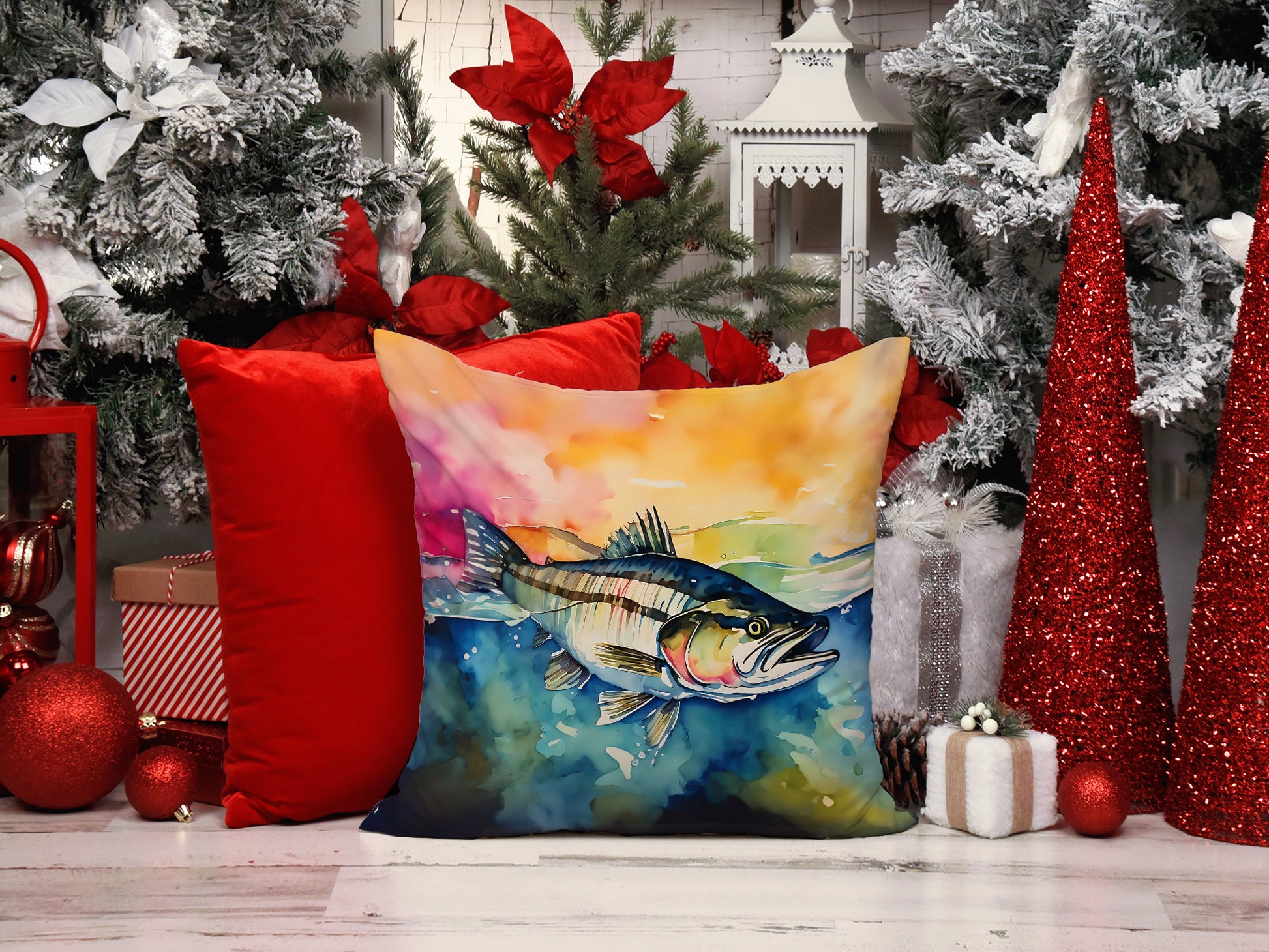 Throw Pillow featuring breed specific Striped Bass artwork. Add a touch of vibrancy and comfort to your outdoor seating with Caroline's Treasures Fabric Decorative Pillow. Measuring approximately 14 inches by 14 inches, this outdoor pillow is crafted to elevate the appeal of your patio furniture, infusing it with vivid color and artistic flair. The pillow includes a 100% Polyester Fabric sham filled with a quality pillow form to provide superior comfort. Innovatively made from our brand new material, specifically woven for its water resistance, this pillow is designed for durability. The soft canvas fabric offers versatility in use, fit for your indoor couch or your outdoor patio, porch, or veranda. The fabric is dyed with colorfast dyes built for resilience against weather conditions, ensuring the pillow retains its beauty over time. Constructed by sewing three fabric pieces to create a sham, the polyester insert is then nestled inside to form the pillow, resulting in an overstuffed pillow that maintains its shape. Both the sham and the pillow insert are proudly made in the United States. As the pillows are handcrafted, there may be minor variations in size, further enhancing their unique charm. Experience comfort in style with Caroline's Treasures Fabric Decorative Pillow.