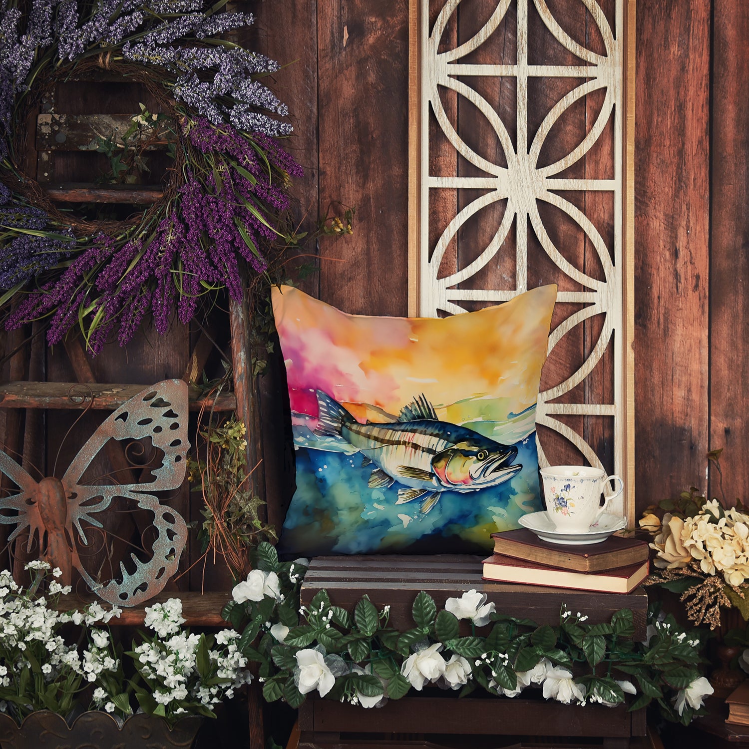 Throw Pillow featuring breed specific Striped Bass artwork. Revitalize your outdoor or indoor living space with Caroline's Treasures 18x18 Fabric Decorative Pillow. With a generously sized dimension of approximately 18 inches by 18 inches, this pillow makes a comfortable and aesthetic addition to any seating area. Made from a unique, water-resistant material developed by Caroline's Treasures, the pillow sham is 100% polyester fabric that's durable and ready to weather any condition. Its vibrant, full-color artwork will not fade over time as it is dyed with color-fast dyes. Whether you place it on your patio furniture, porch, veranda, or indoor couch, its soft canvas fabric ensures a cozy experience. The pillow is handcrafted in the United States, featuring a sham created from three pieces of fabric and a polyester insert for enduring shape and overstuffed comfort. Despite being robustly built to endure the outdoors, it is as soft and snug as your favorite indoor cushions. Please note, as all our pillows are handmade, sizes may vary slightly, adding to the charm of this unique decorative item.