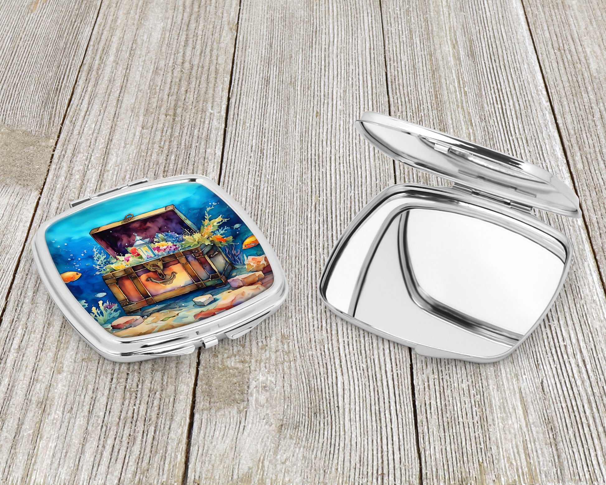Compact Mirror featuring breed specific Treasure Chest artwork. Introducing our Square Compact Mirror, a blend of elegance, functionality, and compactness, perfect for on-the-go touch-ups. This Silvertone metal mirror, with dimensions of 2.75 inches x 3 inches x .3 inches, fits effortlessly into your purse, handbag, or pocket, ensuring that you can check your appearance anytime, anywhere. Our compact mirror stands out with its eye-catching artwork on the front, adding a dash of style to this practical accessory. It is more than just a mirror; it's a statement piece that reflects your personality and aesthetic. When opened, this compact reveals two mirrors inside, doubling your perspective for precise touch-ups. The Silvertone metal construction ensures durability while maintaining a lightweight feel, making it an ideal everyday carry item. Whether you're rushing to a meeting, prepping for a dinner date, or just need a quick check on your look, our Square Compact Mirror is your reliable companion. Experience the perfect blend of style and practicality with this must-have accessory.