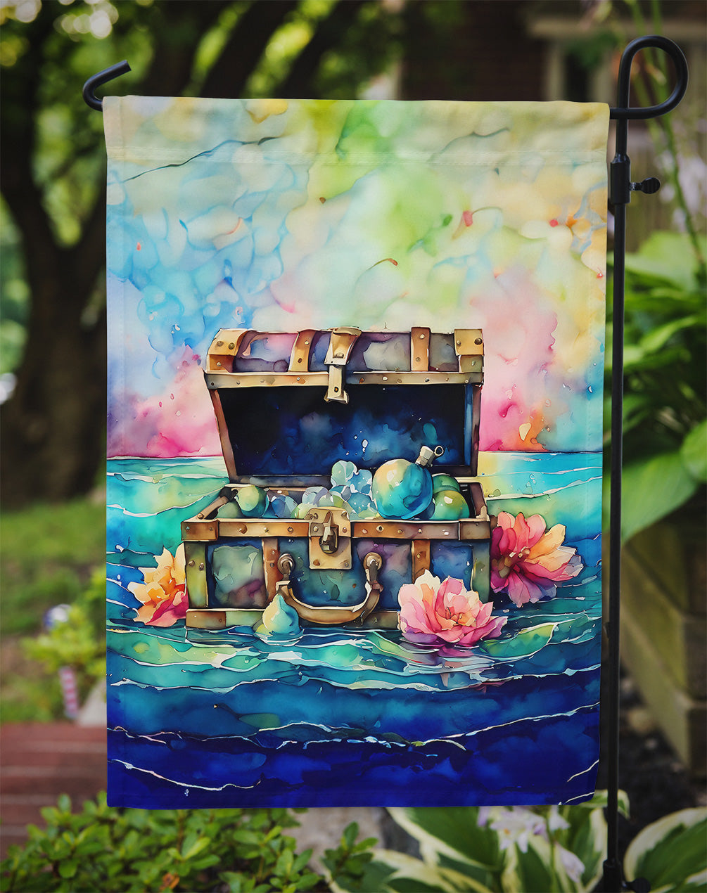 Garden Flag featuring breed specific Treasure Chest artwork. Enhance the beauty of your garden, patio, or yard with Caroline's Treasures Decorative Garden Flag, proudly made in the USA. Crafted from two pieces of thick, double-sided polyester fabric, this 2-ply garden flag is designed to withstand various weather conditions, making it water-resistant and weatherproof. Featuring correctly readable words on both sides, this garden flag offers a delightful visual experience from any angle. With its heavier weight, it stands out among other garden flags, ensuring stability and durability even in wind, rain, and snow. Measuring approximately 11 1/4 inches by 15 1/2 inches, this flag allows you to personalize your outdoor decor. It comes with a 1 1/2-inch sleeve sewn in, allowing easy attachment to any standard garden flag stand or garden size porch hanger (sold separately). Make a statement in your outdoor space with Caroline's Treasures Decorative Garden Flag, a vibrant and high-quality flag that adds color and personality to your surroundings. Proudly made in the USA, it's a symbol of quality craftsmanship and attention to detail.