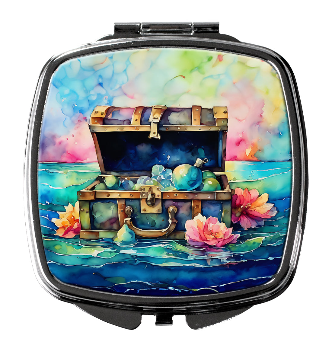 Compact Mirror featuring breed specific Treasure Chest artwork. Introducing our Square Compact Mirror, a blend of elegance, functionality, and compactness, perfect for on-the-go touch-ups. This Silvertone metal mirror, with dimensions of 2.75 inches x 3 inches x .3 inches, fits effortlessly into your purse, handbag, or pocket, ensuring that you can check your appearance anytime, anywhere. Our compact mirror stands out with its eye-catching artwork on the front, adding a dash of style to this practical accessory. It is more than just a mirror; it's a statement piece that reflects your personality and aesthetic. When opened, this compact reveals two mirrors inside, doubling your perspective for precise touch-ups. The Silvertone metal construction ensures durability while maintaining a lightweight feel, making it an ideal everyday carry item. Whether you're rushing to a meeting, prepping for a dinner date, or just need a quick check on your look, our Square Compact Mirror is your reliable companion. Experience the perfect blend of style and practicality with this must-have accessory.
