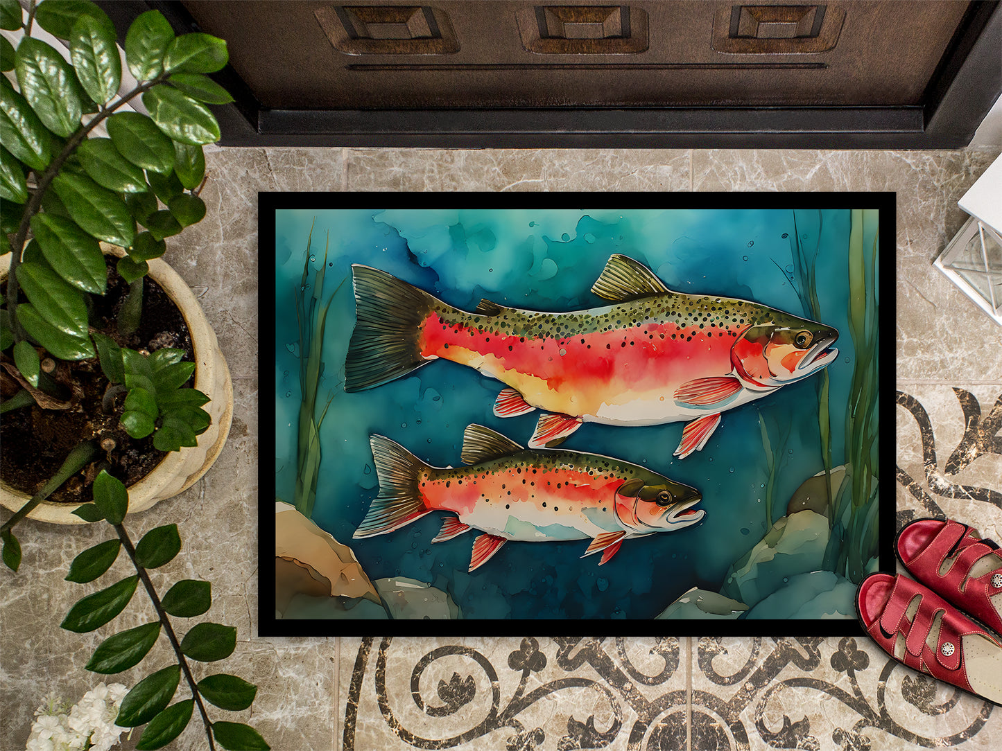Doormat featuring breed specific Trout artwork. Welcome your guests in style with our Artwork Door Mat, designed to withstand almost any weather condition. This mat, measuring approximately 24 by 36 inches, is held together by durable black binding tape. Its top layer, composed of polyester felt, is dyed with the eye-catching image you see on the mat. A few layers below provide the mat with stability, while its rubber bottom is stamped to help prevent slipping and ensures safety. Our mat works wonderfully as both an indoor or outdoor door mat. For cleaning, simply hose it off with water or use a power washer - no need for any cleaner that produces suds. Avoid scrubbing with a brush, instead, opt for the vacuum on floor setting. Designed manufactured and printed in the USA, this mat is a perfect addition to your porch, outdoor kitchen, entryway, or any indoor space. Its unique design makes it a charming decorative rug that greets your guests and adds a stylish touch to your home decor.