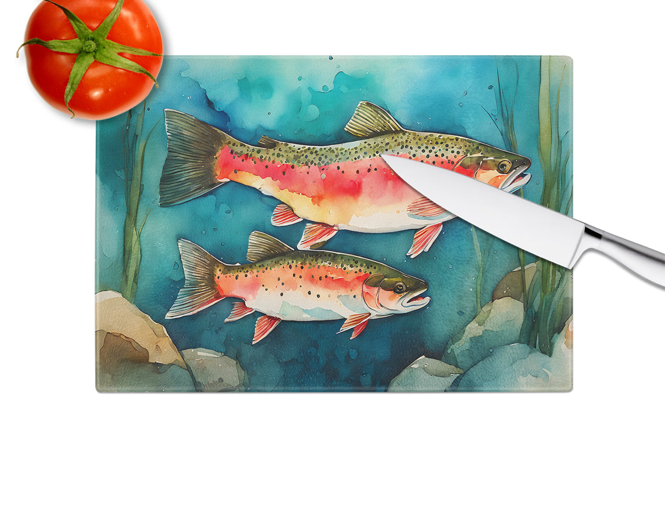 Glass Cutting Board featuring breed specific Trout artwork. Introduce your kitchen to the vibrant, large Decorative Glass Cutting Board from Caroline's Treasures. Crafted from resilient tempered glass, this board is not only a utilitarian necessity but also a colorful art piece. With its generous dimensions of 15 inches in height and 12 inches in length, it offers ample space for all your cutting needs. Every piece showcases captivating artwork from distinguished artists, bringing an aesthetic edge to your kitchen. Beyond its attractive design, this cutting board ensures your countertop stays pristine and unscathed, owing to its heat-resistant properties. Engineered with user convenience in mind, it features non-skid feet for stability, and rounded corners for additional safety. Its robust construction renders it virtually unbreakable, guaranteeing longevity. The board comes with protective feet bumpers, maintaining its position during use. This product is recommended to be hand washed only. Proudly printed and assembled in the United States, this cutting board exemplifies superior craftsmanship. With Caroline's Treasures' Decorative Glass Cutting Board, you're investing in a blend of functionality and artistic flair.