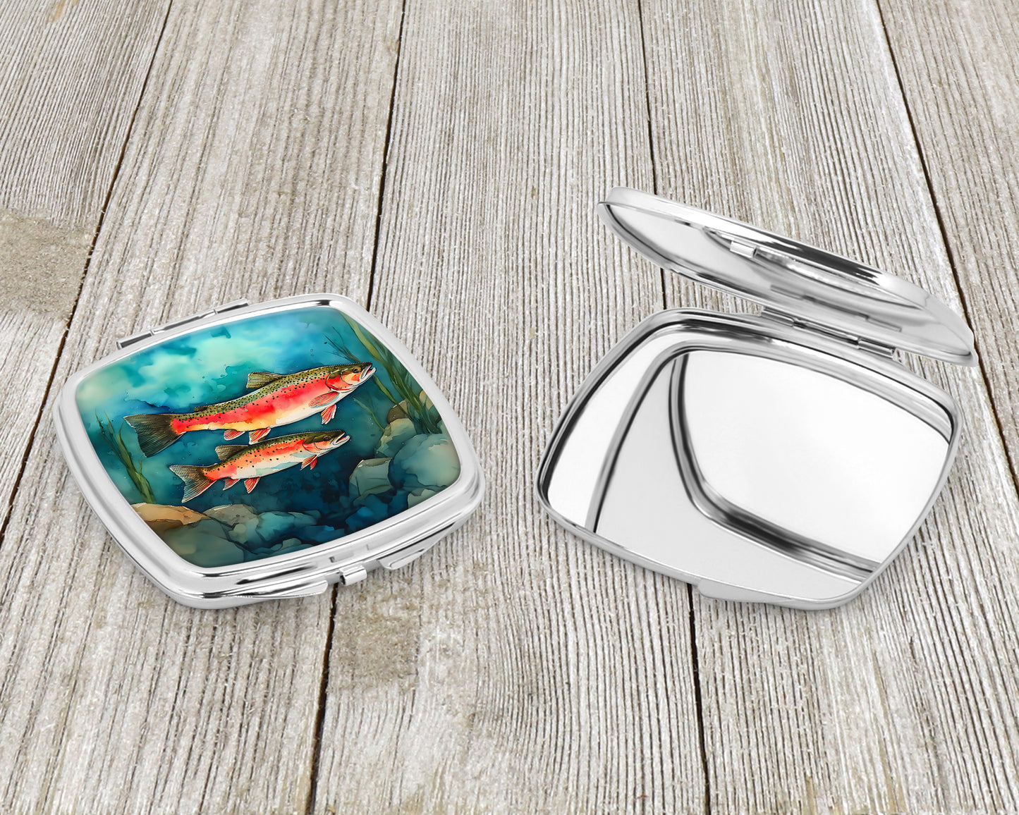 Compact Mirror featuring breed specific Trout artwork. Introducing our Square Compact Mirror, a blend of elegance, functionality, and compactness, perfect for on-the-go touch-ups. This Silvertone metal mirror, with dimensions of 2.75 inches x 3 inches x .3 inches, fits effortlessly into your purse, handbag, or pocket, ensuring that you can check your appearance anytime, anywhere. Our compact mirror stands out with its eye-catching artwork on the front, adding a dash of style to this practical accessory. It is more than just a mirror; it's a statement piece that reflects your personality and aesthetic. When opened, this compact reveals two mirrors inside, doubling your perspective for precise touch-ups. The Silvertone metal construction ensures durability while maintaining a lightweight feel, making it an ideal everyday carry item. Whether you're rushing to a meeting, prepping for a dinner date, or just need a quick check on your look, our Square Compact Mirror is your reliable companion. Experience the perfect blend of style and practicality with this must-have accessory.