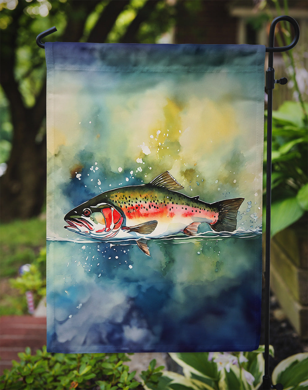 Garden Flag featuring breed specific Trout artwork. Enhance the beauty of your garden, patio, or yard with Caroline's Treasures Decorative Garden Flag, proudly made in the USA. Crafted from two pieces of thick, double-sided polyester fabric, this 2-ply garden flag is designed to withstand various weather conditions, making it water-resistant and weatherproof. Featuring correctly readable words on both sides, this garden flag offers a delightful visual experience from any angle. With its heavier weight, it stands out among other garden flags, ensuring stability and durability even in wind, rain, and snow. Measuring approximately 11 1/4 inches by 15 1/2 inches, this flag allows you to personalize your outdoor decor. It comes with a 1 1/2-inch sleeve sewn in, allowing easy attachment to any standard garden flag stand or garden size porch hanger (sold separately). Make a statement in your outdoor space with Caroline's Treasures Decorative Garden Flag, a vibrant and high-quality flag that adds color and personality to your surroundings. Proudly made in the USA, it's a symbol of quality craftsmanship and attention to detail.