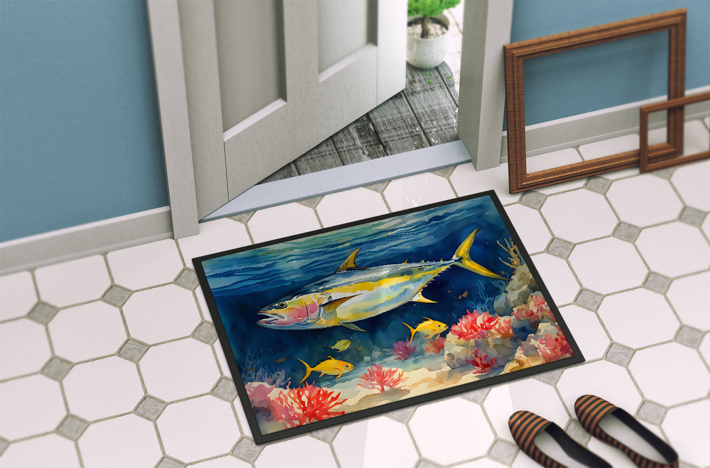 Doormat featuring breed specific Yellowfin Tuna artwork. Welcome your guests in style with our Artwork Door Mat, designed to withstand almost any weather condition. This mat, measuring approximately 24 by 36 inches, is held together by durable black binding tape. Its top layer, composed of polyester felt, is dyed with the eye-catching image you see on the mat. A few layers below provide the mat with stability, while its rubber bottom is stamped to help prevent slipping and ensures safety. Our mat works wonderfully as both an indoor or outdoor door mat. For cleaning, simply hose it off with water or use a power washer - no need for any cleaner that produces suds. Avoid scrubbing with a brush, instead, opt for the vacuum on floor setting. Designed manufactured and printed in the USA, this mat is a perfect addition to your porch, outdoor kitchen, entryway, or any indoor space. Its unique design makes it a charming decorative rug that greets your guests and adds a stylish touch to your home decor.