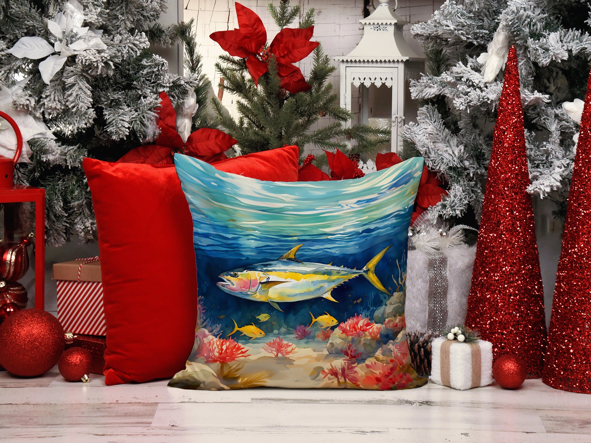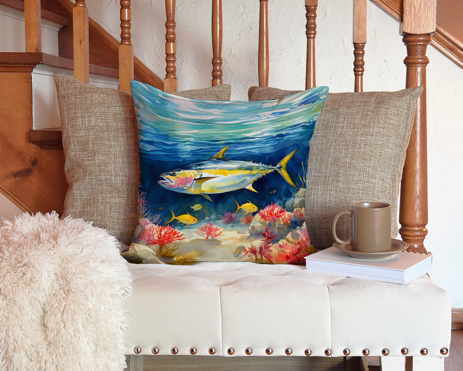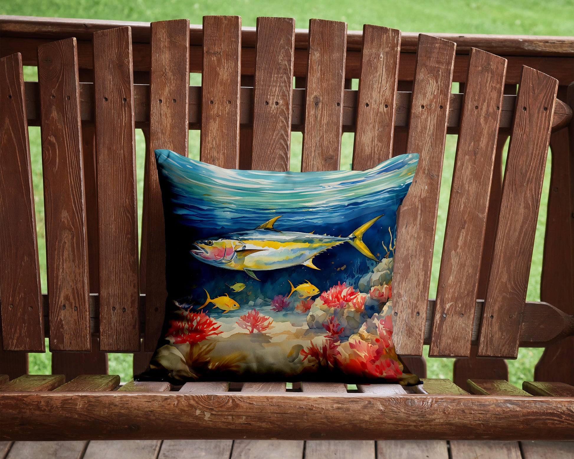 Throw Pillow featuring breed specific Yellowfin Tuna artwork. Add a touch of vibrancy and comfort to your outdoor seating with Caroline's Treasures Fabric Decorative Pillow. Measuring approximately 14 inches by 14 inches, this outdoor pillow is crafted to elevate the appeal of your patio furniture, infusing it with vivid color and artistic flair. The pillow includes a 100% Polyester Fabric sham filled with a quality pillow form to provide superior comfort. Innovatively made from our brand new material, specifically woven for its water resistance, this pillow is designed for durability. The soft canvas fabric offers versatility in use, fit for your indoor couch or your outdoor patio, porch, or veranda. The fabric is dyed with colorfast dyes built for resilience against weather conditions, ensuring the pillow retains its beauty over time. Constructed by sewing three fabric pieces to create a sham, the polyester insert is then nestled inside to form the pillow, resulting in an overstuffed pillow that maintains its shape. Both the sham and the pillow insert are proudly made in the United States. As the pillows are handcrafted, there may be minor variations in size, further enhancing their unique charm. Experience comfort in style with Caroline's Treasures Fabric Decorative Pillow.