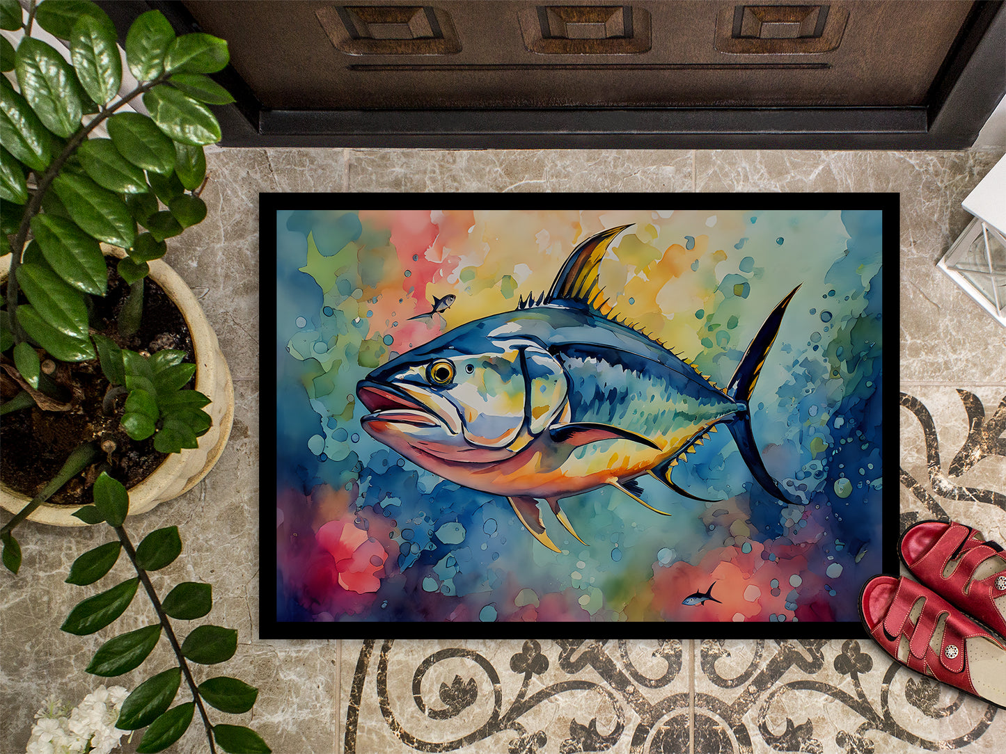Doormat featuring breed specific Yellowfin Tuna artwork. Welcome your guests in style with our Artwork Door Mat, designed to withstand almost any weather condition. This mat, measuring approximately 24 by 36 inches, is held together by durable black binding tape. Its top layer, composed of polyester felt, is dyed with the eye-catching image you see on the mat. A few layers below provide the mat with stability, while its rubber bottom is stamped to help prevent slipping and ensures safety. Our mat works wonderfully as both an indoor or outdoor door mat. For cleaning, simply hose it off with water or use a power washer - no need for any cleaner that produces suds. Avoid scrubbing with a brush, instead, opt for the vacuum on floor setting. Designed manufactured and printed in the USA, this mat is a perfect addition to your porch, outdoor kitchen, entryway, or any indoor space. Its unique design makes it a charming decorative rug that greets your guests and adds a stylish touch to your home decor.