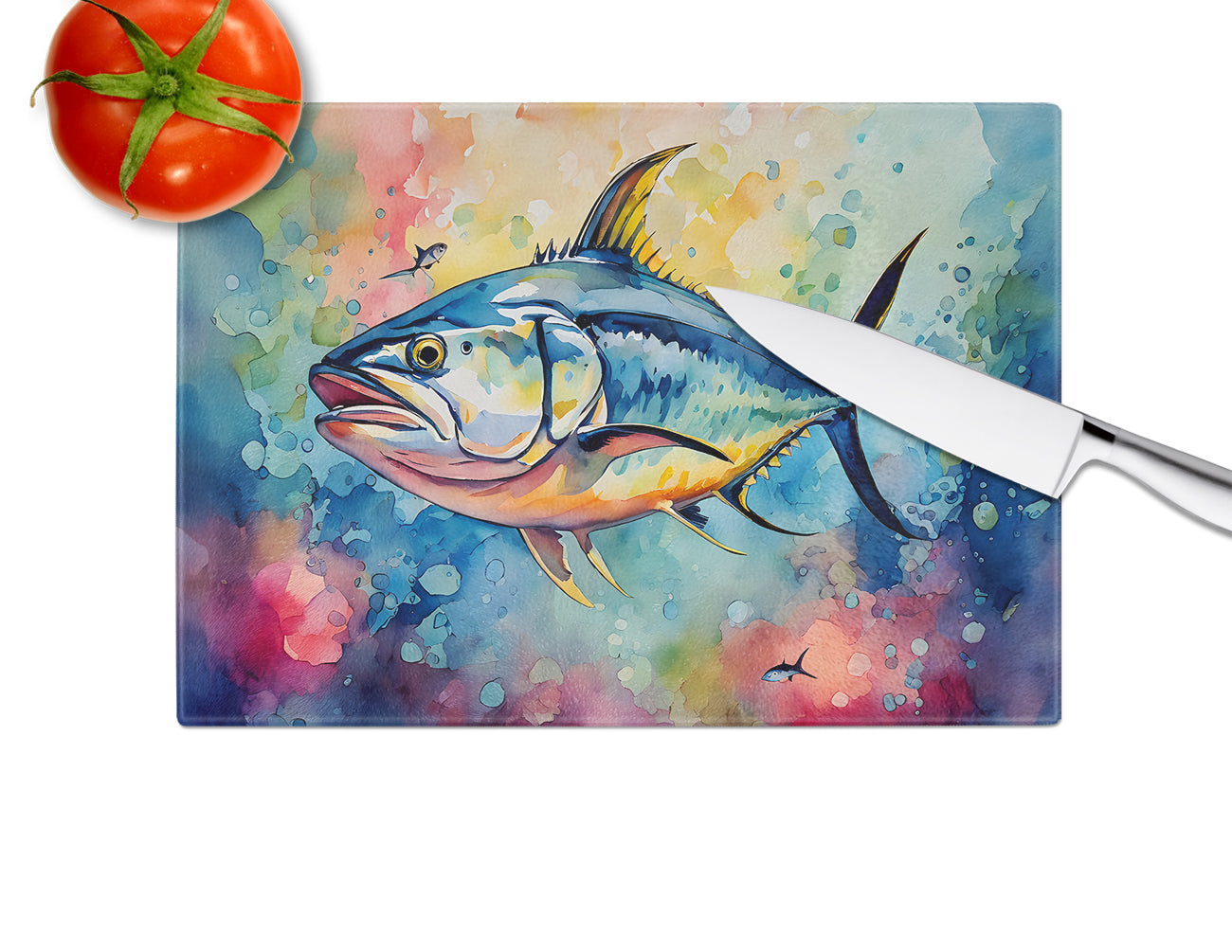 Glass Cutting Board featuring breed specific Yellowfin Tuna artwork. Introduce your kitchen to the vibrant, large Decorative Glass Cutting Board from Caroline's Treasures. Crafted from resilient tempered glass, this board is not only a utilitarian necessity but also a colorful art piece. With its generous dimensions of 15 inches in height and 12 inches in length, it offers ample space for all your cutting needs. Every piece showcases captivating artwork from distinguished artists, bringing an aesthetic edge to your kitchen. Beyond its attractive design, this cutting board ensures your countertop stays pristine and unscathed, owing to its heat-resistant properties. Engineered with user convenience in mind, it features non-skid feet for stability, and rounded corners for additional safety. Its robust construction renders it virtually unbreakable, guaranteeing longevity. The board comes with protective feet bumpers, maintaining its position during use. This product is recommended to be hand washed only. Proudly printed and assembled in the United States, this cutting board exemplifies superior craftsmanship. With Caroline's Treasures' Decorative Glass Cutting Board, you're investing in a blend of functionality and artistic flair.