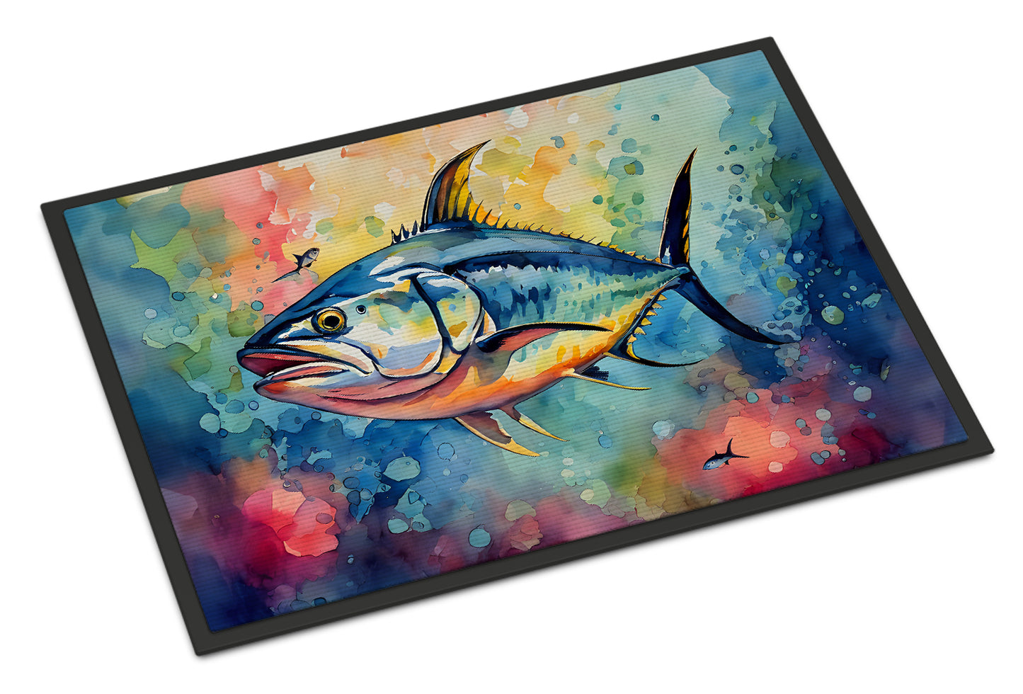 Doormat featuring breed specific Yellowfin Tuna artwork. Welcome your guests in style with our Artwork Door Mat, designed to withstand almost any weather condition. This mat, measuring approximately 18 by 27 inches, is held together by durable black binding tape. Its top layer, composed of polyester felt, is dyed with the eye-catching image you see on the mat. A few layers below provide the mat with stability, while its rubber bottom is stamped to help prevent slipping and ensures safety. Our mat works wonderfully as both an indoor or outdoor door mat. For cleaning, simply hose it off with water or use a power washer - no need for any cleaner that produces suds. Avoid scrubbing with a brush, instead, opt for the vacuum on floor setting. Designed manufactured and printed in the USA, this mat is a perfect addition to your porch, outdoor kitchen, entryway, or any indoor space. Its unique design makes it a charming decorative rug that greets your guests and adds a stylish touch to your home decor.