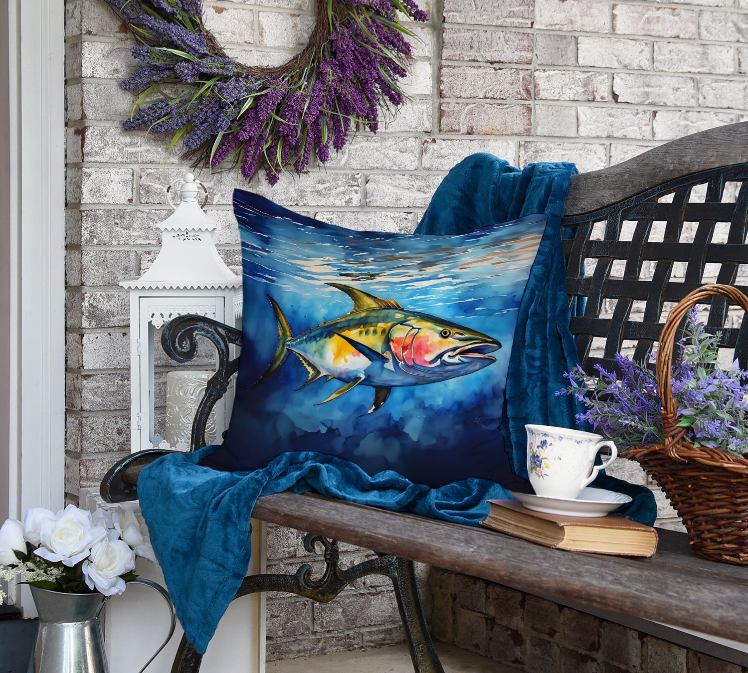Throw Pillow featuring breed specific Yellowfin Tuna artwork. Revitalize your outdoor or indoor living space with Caroline's Treasures 18x18 Fabric Decorative Pillow. With a generously sized dimension of approximately 18 inches by 18 inches, this pillow makes a comfortable and aesthetic addition to any seating area. Made from a unique, water-resistant material developed by Caroline's Treasures, the pillow sham is 100% polyester fabric that's durable and ready to weather any condition. Its vibrant, full-color artwork will not fade over time as it is dyed with color-fast dyes. Whether you place it on your patio furniture, porch, veranda, or indoor couch, its soft canvas fabric ensures a cozy experience. The pillow is handcrafted in the United States, featuring a sham created from three pieces of fabric and a polyester insert for enduring shape and overstuffed comfort. Despite being robustly built to endure the outdoors, it is as soft and snug as your favorite indoor cushions. Please note, as all our pillows are handmade, sizes may vary slightly, adding to the charm of this unique decorative item.