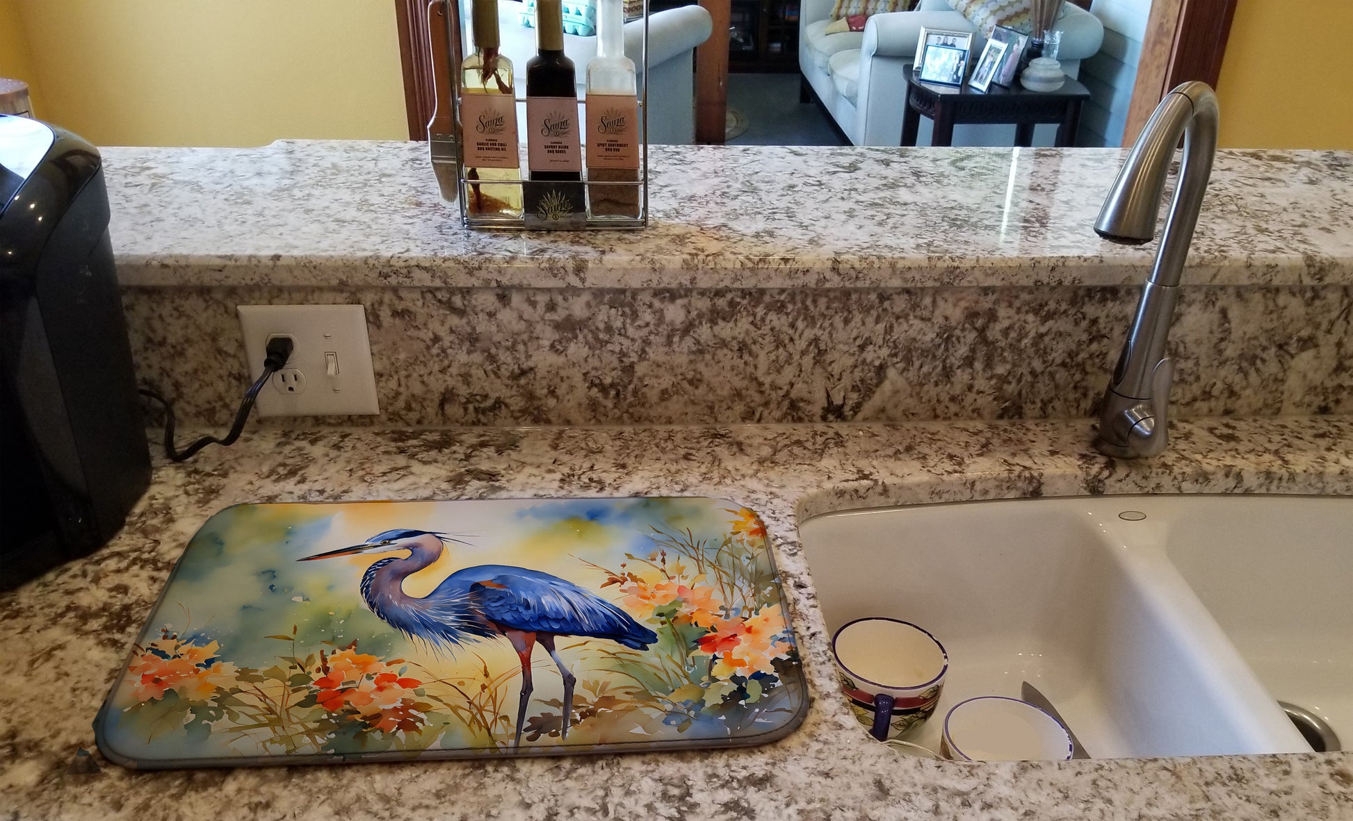 Dish Drying Mat featuring breed specific Blue Heron artwork. Say goodbye to messy countertops and soggy dish towels with our innovative dish drying mat. Our high-quality dish drying pad is designed to keep your countertops dry while offering a stylish and efficient solution. Whether you're air drying dishes, glasses, stemware, silverware, pots, pans, bottles, or even fruits and vegetables, our dish mat is the perfect choice. The 14 inches x 22 inches size fits most counters and dish drying racks, and the non-slip design ensures stability. Made with water-absorbent polyester and a polyurethane foam insert, our dish drying mat is not only functional but also durable. It's machine washable and printed in the USA for long-lasting use. The beautiful artwork adds flair to your kitchen decor, making it a perfect housewarming gift or present for any occasion. Upgrade your kitchen experience with our absorbent and versatile dish drying mat.