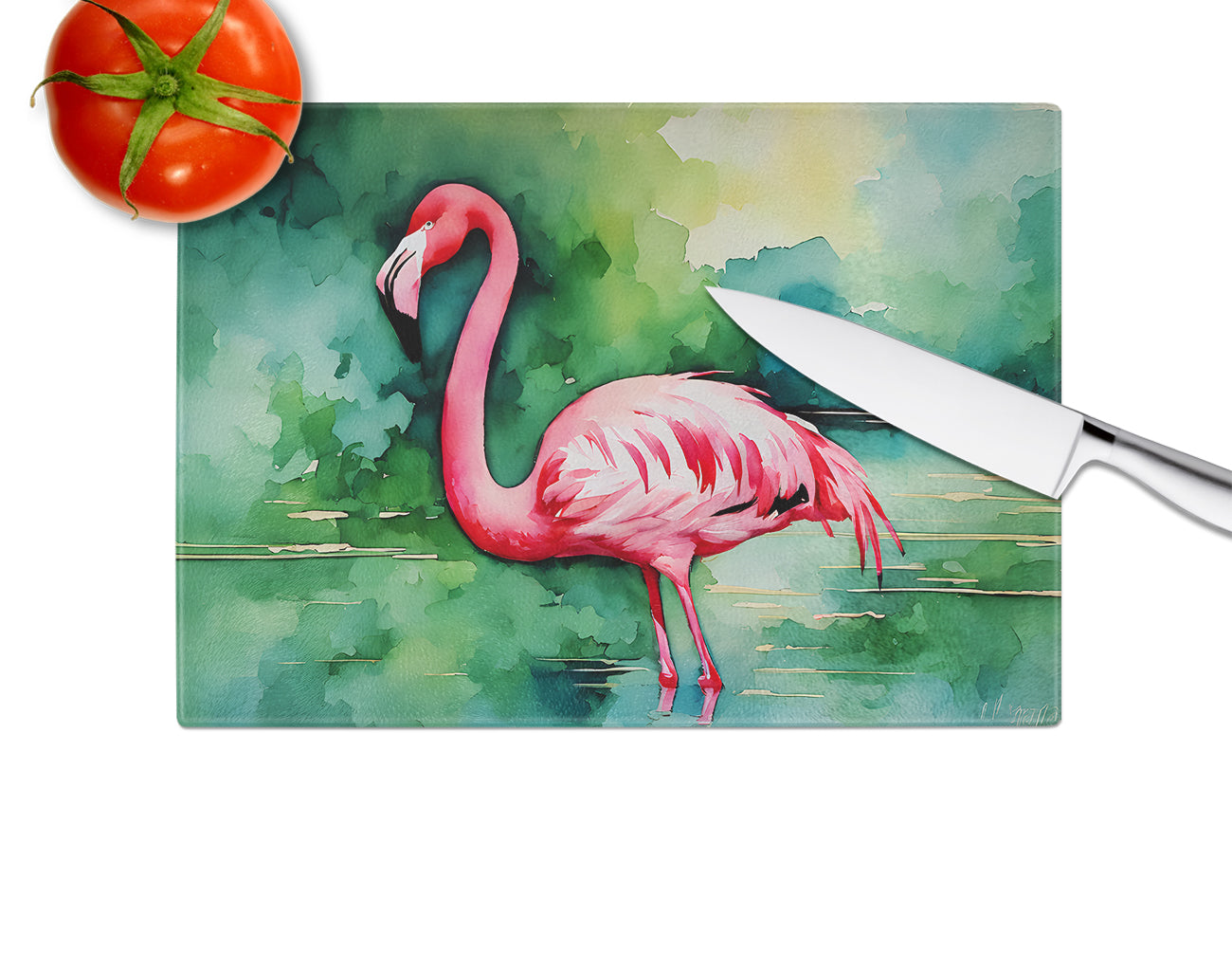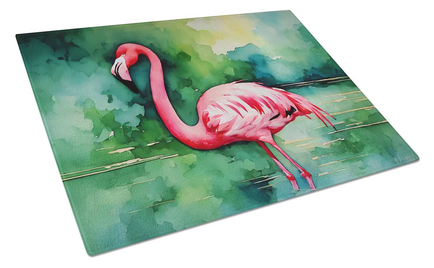 Glass Cutting Board featuring breed specific Flamingo artwork. Introduce your kitchen to the vibrant, large Decorative Glass Cutting Board from Caroline's Treasures. Crafted from resilient tempered glass, this board is not only a utilitarian necessity but also a colorful art piece. With its generous dimensions of 15 inches in height and 12 inches in length, it offers ample space for all your cutting needs. Every piece showcases captivating artwork from distinguished artists, bringing an aesthetic edge to your kitchen. Beyond its attractive design, this cutting board ensures your countertop stays pristine and unscathed, owing to its heat-resistant properties. Engineered with user convenience in mind, it features non-skid feet for stability, and rounded corners for additional safety. Its robust construction renders it virtually unbreakable, guaranteeing longevity. The board comes with protective feet bumpers, maintaining its position during use. This product is recommended to be hand washed only. Proudly printed and assembled in the United States, this cutting board exemplifies superior craftsmanship. With Caroline's Treasures' Decorative Glass Cutting Board, you're investing in a blend of functionality and artistic flair.