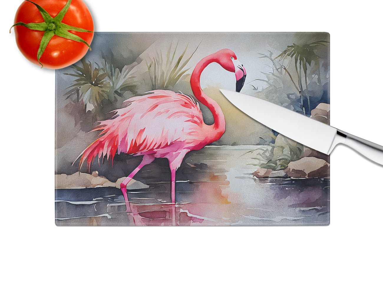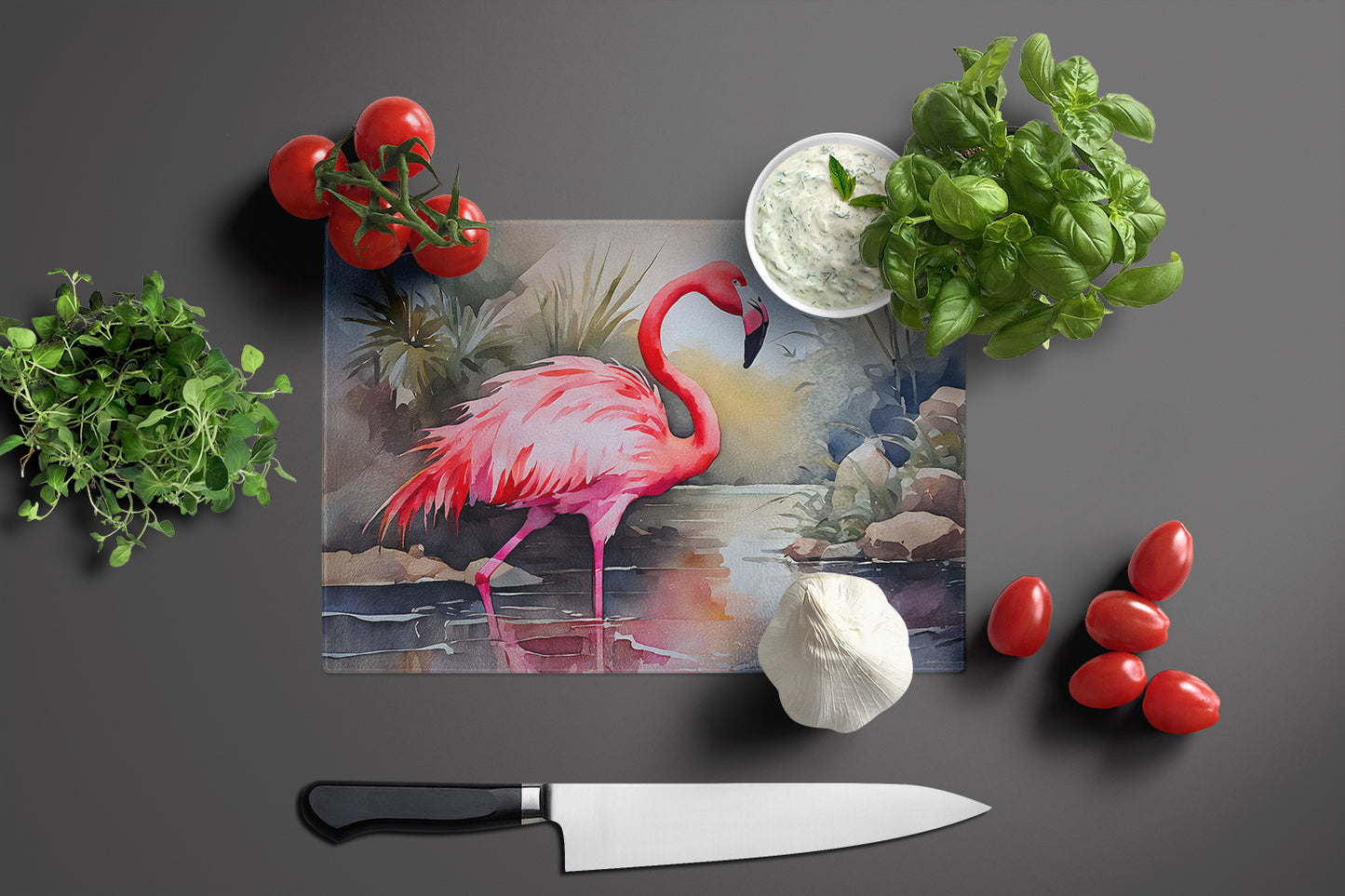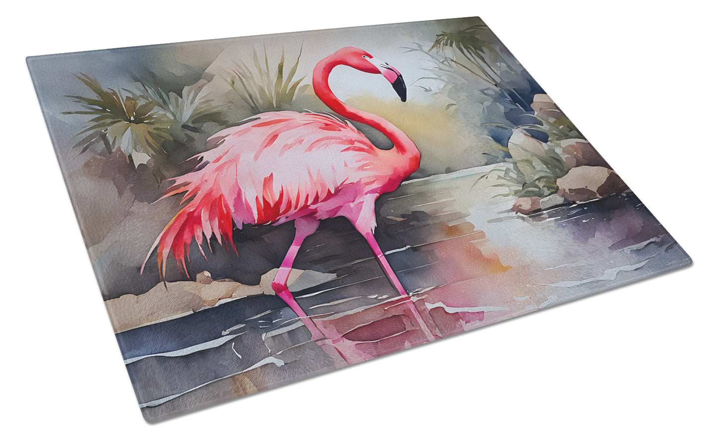 Glass Cutting Board featuring breed specific Flamingo artwork. Introduce your kitchen to the vibrant, large Decorative Glass Cutting Board from Caroline's Treasures. Crafted from resilient tempered glass, this board is not only a utilitarian necessity but also a colorful art piece. With its generous dimensions of 15 inches in height and 12 inches in length, it offers ample space for all your cutting needs. Every piece showcases captivating artwork from distinguished artists, bringing an aesthetic edge to your kitchen. Beyond its attractive design, this cutting board ensures your countertop stays pristine and unscathed, owing to its heat-resistant properties. Engineered with user convenience in mind, it features non-skid feet for stability, and rounded corners for additional safety. Its robust construction renders it virtually unbreakable, guaranteeing longevity. The board comes with protective feet bumpers, maintaining its position during use. This product is recommended to be hand washed only. Proudly printed and assembled in the United States, this cutting board exemplifies superior craftsmanship. With Caroline's Treasures' Decorative Glass Cutting Board, you're investing in a blend of functionality and artistic flair.