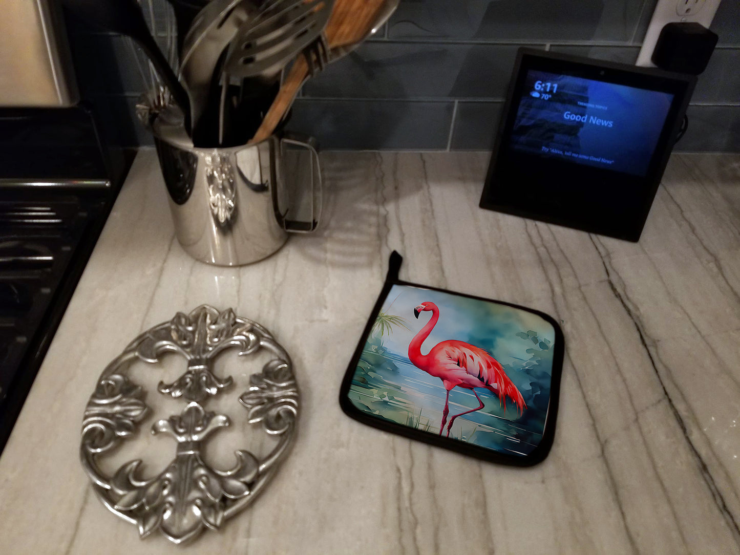 Pair of Pot Holders featuring breed specific Flamingo artwork. A Pair of Pot Holders to match your kitchen decor. Made in the USA these are thick and functional. Full color artwork decorates the front polyester fabric of the hot pad and accented by a black trim. Use these at as a trivet for your Thanksgiving or Christmas tablescape. Filled with insulated fabric and quilted for durability. These colorful pot holders will make a great gift for your favorite home cook or executive chef. Each pot holder measures approximately 7 1/2 inches by 7 1/2 inches. A hanging tab is included.