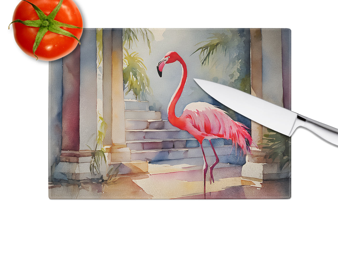 Glass Cutting Board featuring breed specific Flamingo artwork. Introduce your kitchen to the vibrant, large Decorative Glass Cutting Board from Caroline's Treasures. Crafted from resilient tempered glass, this board is not only a utilitarian necessity but also a colorful art piece. With its generous dimensions of 15 inches in height and 12 inches in length, it offers ample space for all your cutting needs. Every piece showcases captivating artwork from distinguished artists, bringing an aesthetic edge to your kitchen. Beyond its attractive design, this cutting board ensures your countertop stays pristine and unscathed, owing to its heat-resistant properties. Engineered with user convenience in mind, it features non-skid feet for stability, and rounded corners for additional safety. Its robust construction renders it virtually unbreakable, guaranteeing longevity. The board comes with protective feet bumpers, maintaining its position during use. This product is recommended to be hand washed only. Proudly printed and assembled in the United States, this cutting board exemplifies superior craftsmanship. With Caroline's Treasures' Decorative Glass Cutting Board, you're investing in a blend of functionality and artistic flair.