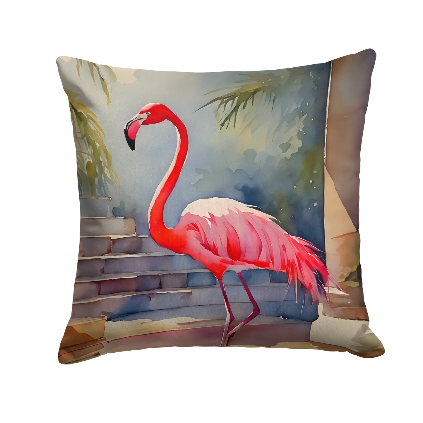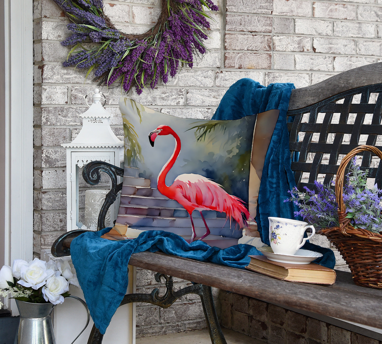 Throw Pillow featuring breed specific Flamingo artwork. Revitalize your outdoor or indoor living space with Caroline's Treasures 18x18 Fabric Decorative Pillow. With a generously sized dimension of approximately 18 inches by 18 inches, this pillow makes a comfortable and aesthetic addition to any seating area. Made from a unique, water-resistant material developed by Caroline's Treasures, the pillow sham is 100% polyester fabric that's durable and ready to weather any condition. Its vibrant, full-color artwork will not fade over time as it is dyed with color-fast dyes. Whether you place it on your patio furniture, porch, veranda, or indoor couch, its soft canvas fabric ensures a cozy experience. The pillow is handcrafted in the United States, featuring a sham created from three pieces of fabric and a polyester insert for enduring shape and overstuffed comfort. Despite being robustly built to endure the outdoors, it is as soft and snug as your favorite indoor cushions. Please note, as all our pillows are handmade, sizes may vary slightly, adding to the charm of this unique decorative item.