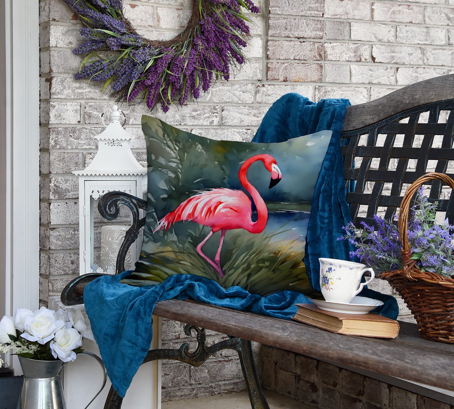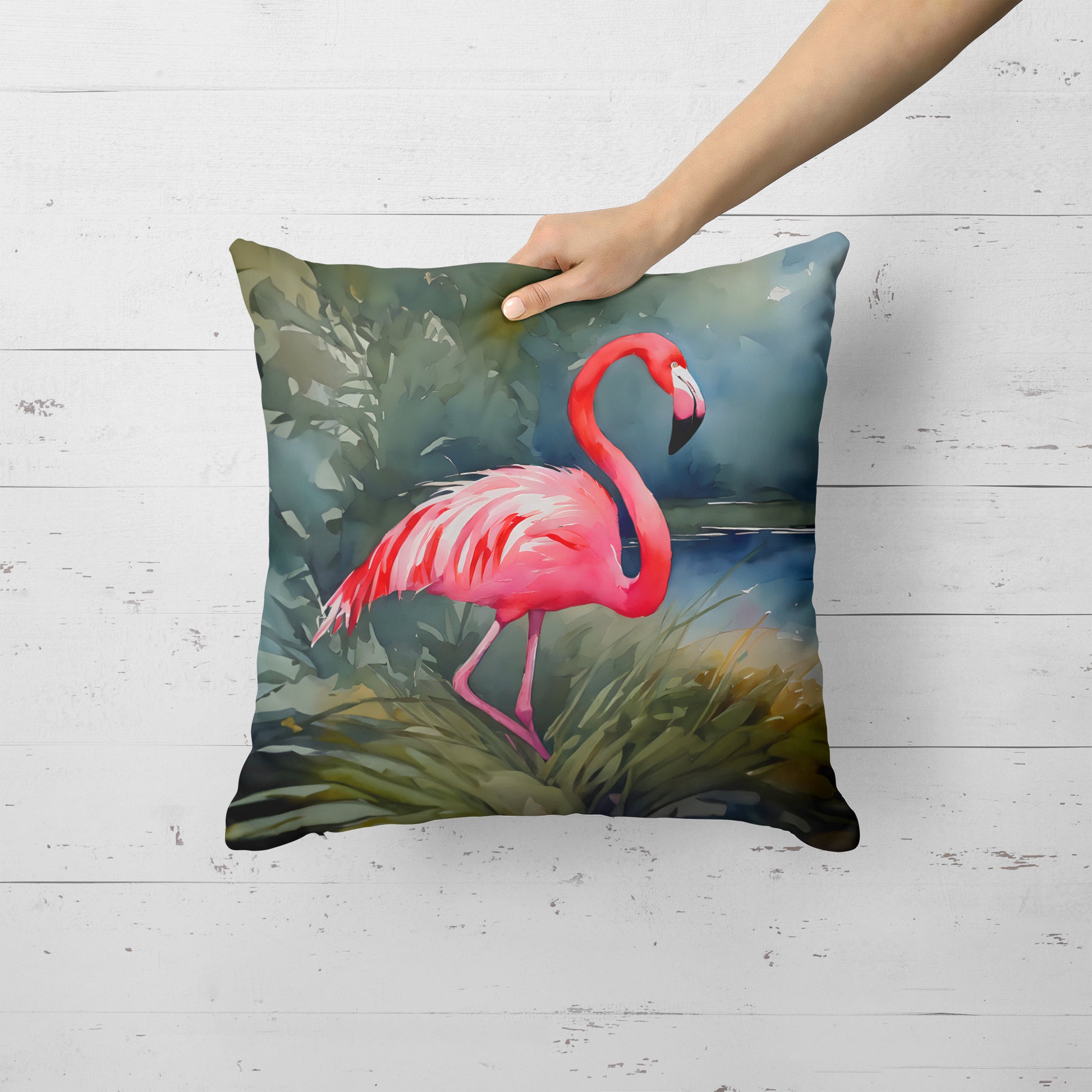 Throw Pillow featuring breed specific Flamingo artwork. Revitalize your outdoor or indoor living space with Caroline's Treasures 18x18 Fabric Decorative Pillow. With a generously sized dimension of approximately 18 inches by 18 inches, this pillow makes a comfortable and aesthetic addition to any seating area. Made from a unique, water-resistant material developed by Caroline's Treasures, the pillow sham is 100% polyester fabric that's durable and ready to weather any condition. Its vibrant, full-color artwork will not fade over time as it is dyed with color-fast dyes. Whether you place it on your patio furniture, porch, veranda, or indoor couch, its soft canvas fabric ensures a cozy experience. The pillow is handcrafted in the United States, featuring a sham created from three pieces of fabric and a polyester insert for enduring shape and overstuffed comfort. Despite being robustly built to endure the outdoors, it is as soft and snug as your favorite indoor cushions. Please note, as all our pillows are handmade, sizes may vary slightly, adding to the charm of this unique decorative item.