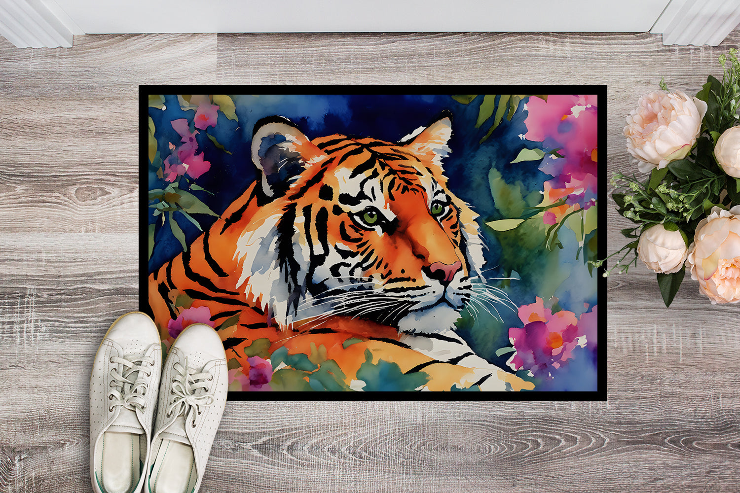 Doormat featuring breed specific Bengal Tiger artwork. Welcome your guests in style with our Artwork Door Mat, designed to withstand almost any weather condition. This mat, measuring approximately 24 by 36 inches, is held together by durable black binding tape. Its top layer, composed of polyester felt, is dyed with the eye-catching image you see on the mat. A few layers below provide the mat with stability, while its rubber bottom is stamped to help prevent slipping and ensures safety. Our mat works wonderfully as both an indoor or outdoor door mat. For cleaning, simply hose it off with water or use a power washer - no need for any cleaner that produces suds. Avoid scrubbing with a brush, instead, opt for the vacuum on floor setting. Designed manufactured and printed in the USA, this mat is a perfect addition to your porch, outdoor kitchen, entryway, or any indoor space. Its unique design makes it a charming decorative rug that greets your guests and adds a stylish touch to your home decor.