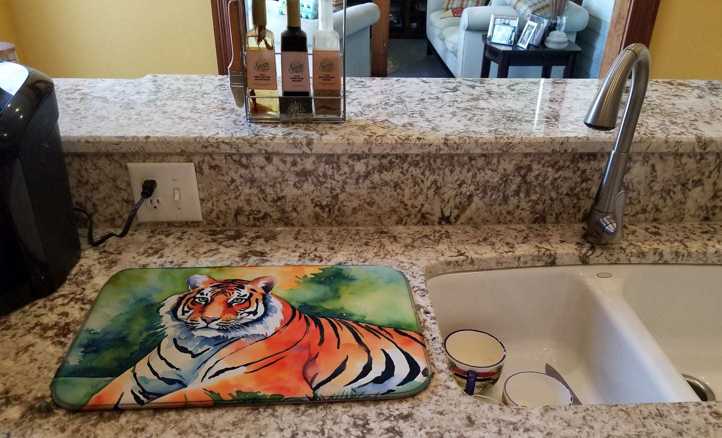 Dish Drying Mat featuring breed specific Bengal Tiger artwork. Say goodbye to messy countertops and soggy dish towels with our innovative dish drying mat. Our high-quality dish drying pad is designed to keep your countertops dry while offering a stylish and efficient solution. Whether you're air drying dishes, glasses, stemware, silverware, pots, pans, bottles, or even fruits and vegetables, our dish mat is the perfect choice. The 14 inches x 22 inches size fits most counters and dish drying racks, and the non-slip design ensures stability. Made with water-absorbent polyester and a polyurethane foam insert, our dish drying mat is not only functional but also durable. It's machine washable and printed in the USA for long-lasting use. The beautiful artwork adds flair to your kitchen decor, making it a perfect housewarming gift or present for any occasion. Upgrade your kitchen experience with our absorbent and versatile dish drying mat.