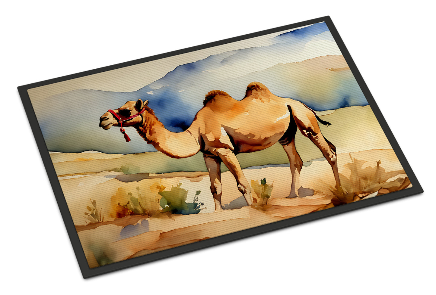 Doormat featuring breed specific Camel artwork. Welcome your guests in style with our Artwork Door Mat, designed to withstand almost any weather condition. This mat, measuring approximately 18 by 27 inches, is held together by durable black binding tape. Its top layer, composed of polyester felt, is dyed with the eye-catching image you see on the mat. A few layers below provide the mat with stability, while its rubber bottom is stamped to help prevent slipping and ensures safety. Our mat works wonderfully as both an indoor or outdoor door mat. For cleaning, simply hose it off with water or use a power washer - no need for any cleaner that produces suds. Avoid scrubbing with a brush, instead, opt for the vacuum on floor setting. Designed manufactured and printed in the USA, this mat is a perfect addition to your porch, outdoor kitchen, entryway, or any indoor space. Its unique design makes it a charming decorative rug that greets your guests and adds a stylish touch to your home decor.
