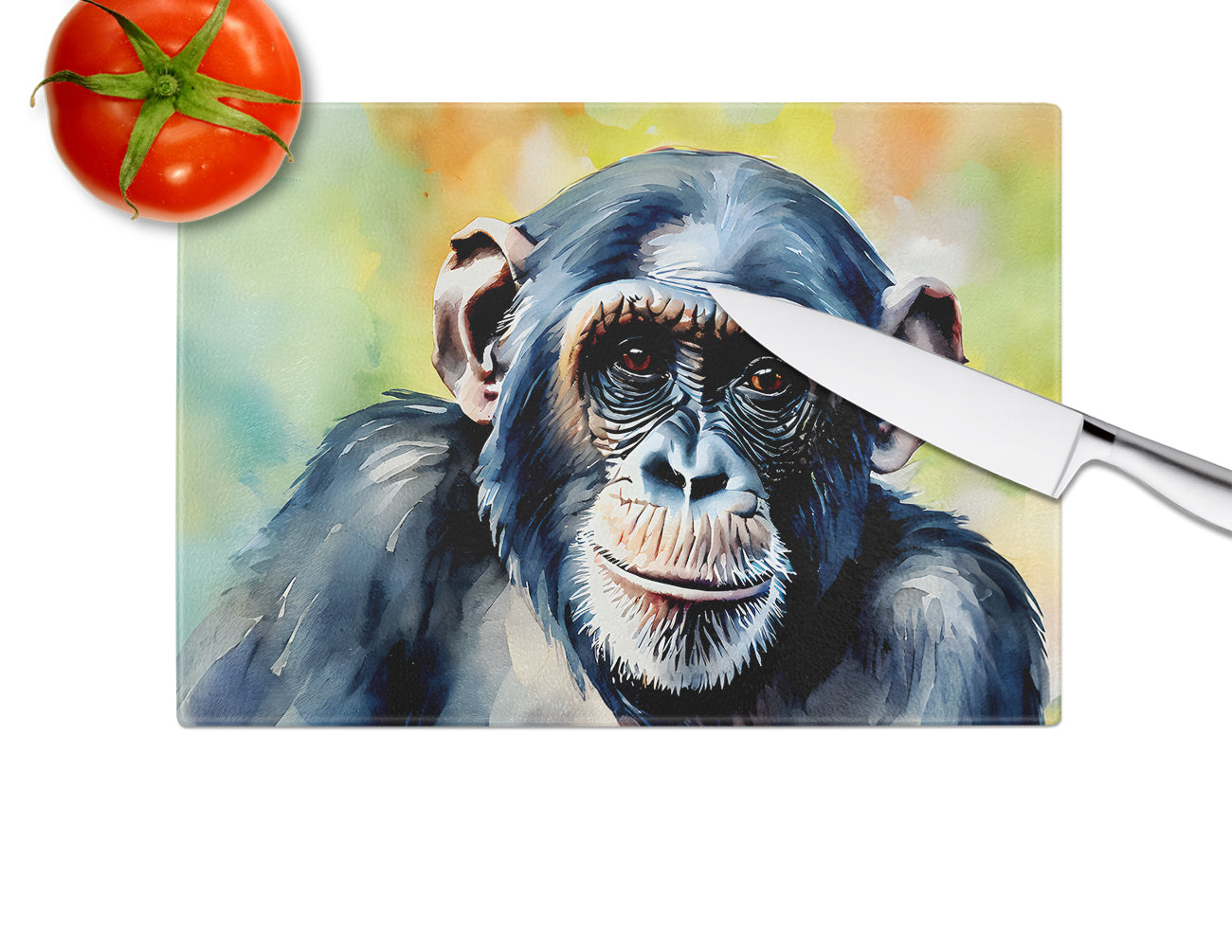 Glass Cutting Board featuring breed specific Chimpanzee artwork. Introduce your kitchen to the vibrant, large Decorative Glass Cutting Board from Caroline's Treasures. Crafted from resilient tempered glass, this board is not only a utilitarian necessity but also a colorful art piece. With its generous dimensions of 15 inches in height and 12 inches in length, it offers ample space for all your cutting needs. Every piece showcases captivating artwork from distinguished artists, bringing an aesthetic edge to your kitchen. Beyond its attractive design, this cutting board ensures your countertop stays pristine and unscathed, owing to its heat-resistant properties. Engineered with user convenience in mind, it features non-skid feet for stability, and rounded corners for additional safety. Its robust construction renders it virtually unbreakable, guaranteeing longevity. The board comes with protective feet bumpers, maintaining its position during use. This product is recommended to be hand washed only. Proudly printed and assembled in the United States, this cutting board exemplifies superior craftsmanship. With Caroline's Treasures' Decorative Glass Cutting Board, you're investing in a blend of functionality and artistic flair.