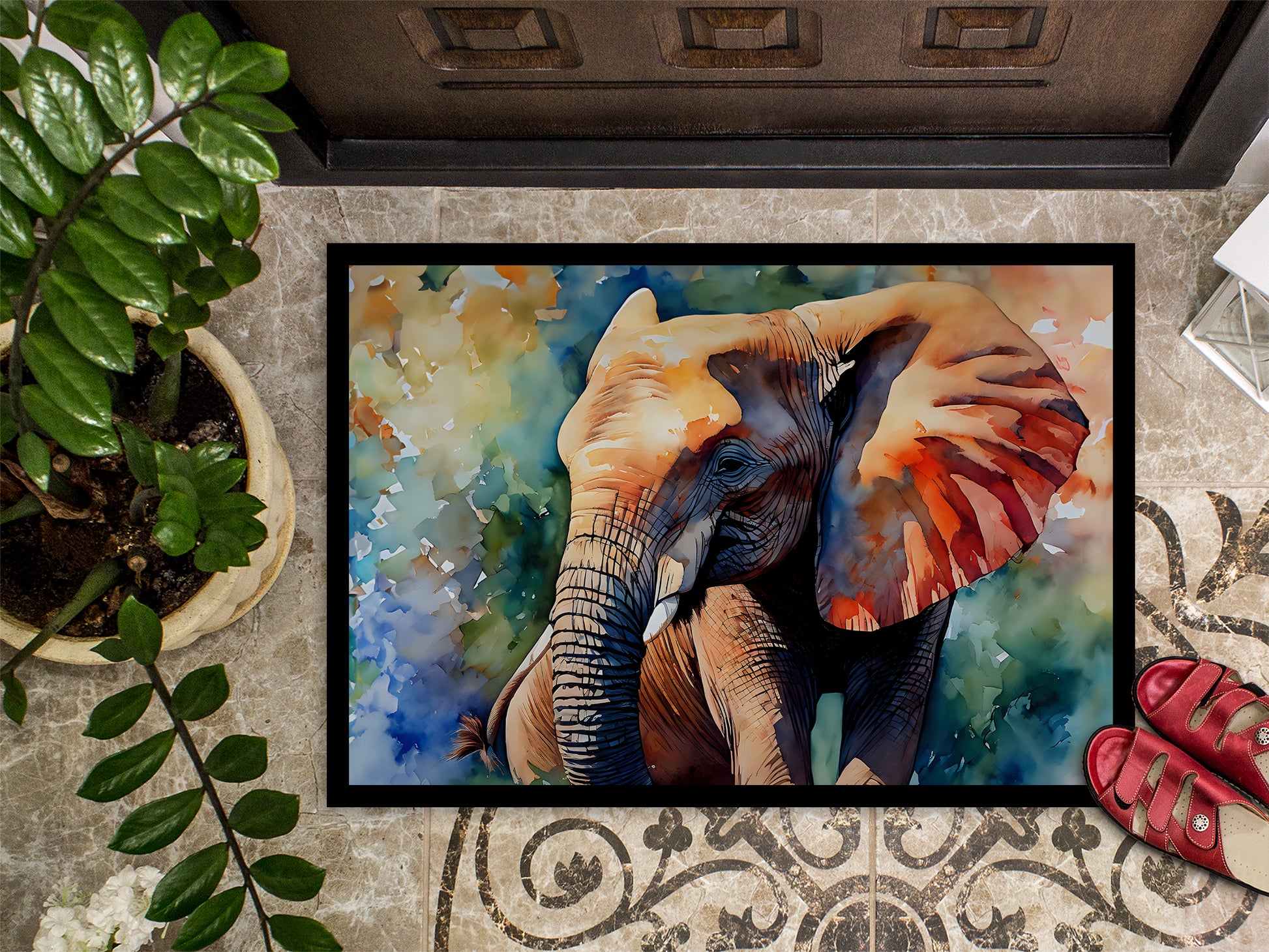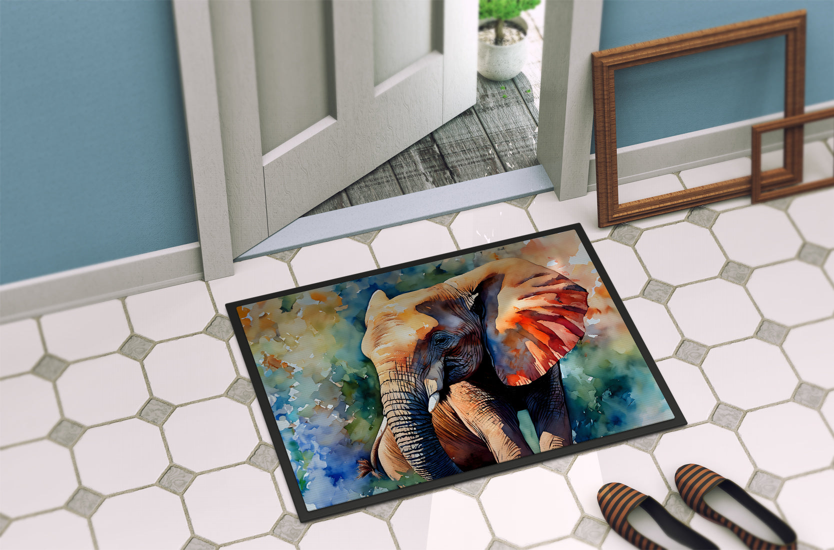 Doormat featuring breed specific Elephant artwork. Welcome your guests in style with our Artwork Door Mat, designed to withstand almost any weather condition. This mat, measuring approximately 18 by 27 inches, is held together by durable black binding tape. Its top layer, composed of polyester felt, is dyed with the eye-catching image you see on the mat. A few layers below provide the mat with stability, while its rubber bottom is stamped to help prevent slipping and ensures safety. Our mat works wonderfully as both an indoor or outdoor door mat. For cleaning, simply hose it off with water or use a power washer - no need for any cleaner that produces suds. Avoid scrubbing with a brush, instead, opt for the vacuum on floor setting. Designed manufactured and printed in the USA, this mat is a perfect addition to your porch, outdoor kitchen, entryway, or any indoor space. Its unique design makes it a charming decorative rug that greets your guests and adds a stylish touch to your home decor.