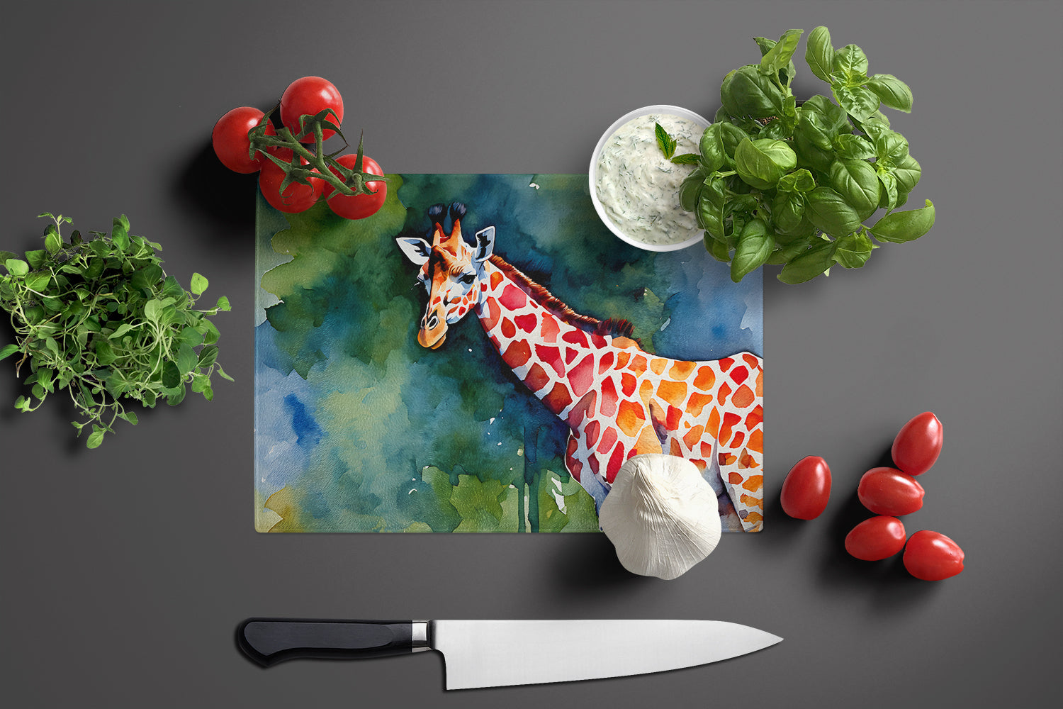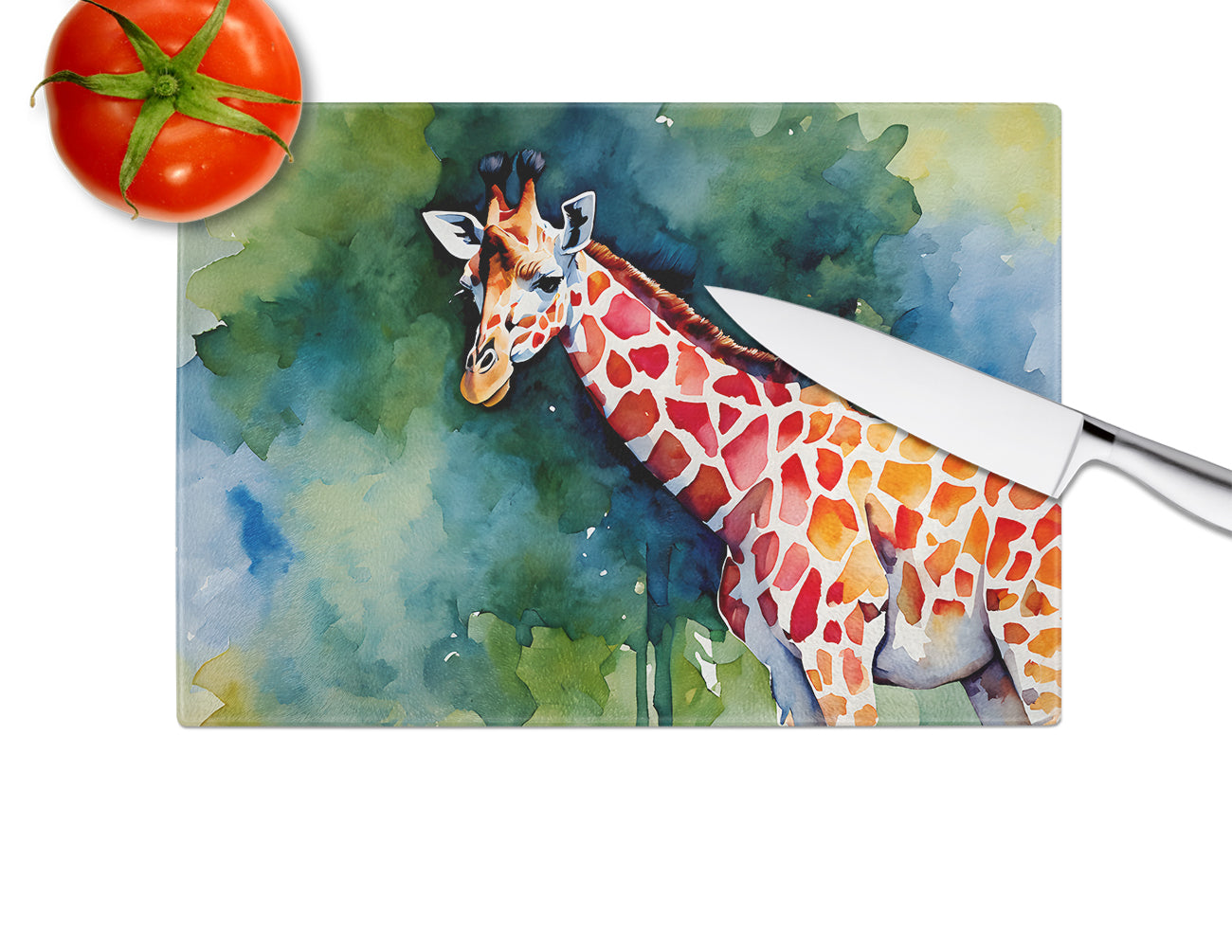 Glass Cutting Board featuring breed specific Giraffe artwork. Introduce your kitchen to the vibrant, large Decorative Glass Cutting Board from Caroline's Treasures. Crafted from resilient tempered glass, this board is not only a utilitarian necessity but also a colorful art piece. With its generous dimensions of 15 inches in height and 12 inches in length, it offers ample space for all your cutting needs. Every piece showcases captivating artwork from distinguished artists, bringing an aesthetic edge to your kitchen. Beyond its attractive design, this cutting board ensures your countertop stays pristine and unscathed, owing to its heat-resistant properties. Engineered with user convenience in mind, it features non-skid feet for stability, and rounded corners for additional safety. Its robust construction renders it virtually unbreakable, guaranteeing longevity. The board comes with protective feet bumpers, maintaining its position during use. This product is recommended to be hand washed only. Proudly printed and assembled in the United States, this cutting board exemplifies superior craftsmanship. With Caroline's Treasures' Decorative Glass Cutting Board, you're investing in a blend of functionality and artistic flair.