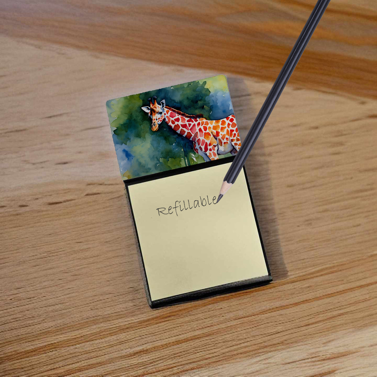 Sticky Note Holder featuring breed specific Giraffe artwork. Add a touch of creativity and flair to your desk with the Decorative Sticky Note Holder from Caroline's Treasures. This uniquely designed sticky note dispenser will not only keep your notes in one place but also add an artistic element to your workspace. The top of the holder features beautiful artwork that is sure to catch the eye. Crafted for convenience, this sticky note holder comes with a small pad of 3-inch x 3-inch sticky notes at the bottom. The holder is designed for easy refilling; simply remove the last sheet of a new sticky note pad and stick it onto the board. This feature ensures you will always have sticky notes at your disposal. This Sticky Note Holder makes a perfect gift. Be it for your colleagues at work, your Facebook friends, or even your dog groomer or hairdresser, this versatile product fits the bill. You can use it for making grocery lists, leaving notes for loved ones, or for jotting down important reminders. The bottom board is rigid and can be magnetized by adding a business card size magnet to the back (sold separately). This makes it even more versatile, allowing you to place it on a refrigerator or any other magnetic surface. With this Sticky Note Holder, you're not only organizing your notes, but also personalizing your space.