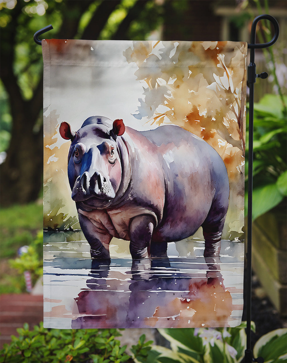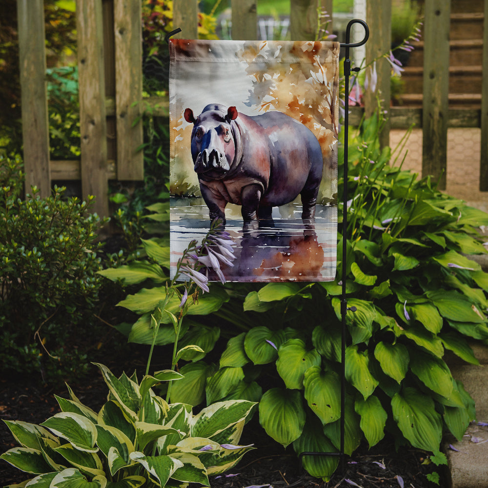 Garden Flag featuring breed specific Hippopotamus artwork. Enhance the beauty of your garden, patio, or yard with Caroline's Treasures Decorative Garden Flag, proudly made in the USA. Crafted from two pieces of thick, double-sided polyester fabric, this 2-ply garden flag is designed to withstand various weather conditions, making it water-resistant and weatherproof. Featuring correctly readable words on both sides, this garden flag offers a delightful visual experience from any angle. With its heavier weight, it stands out among other garden flags, ensuring stability and durability even in wind, rain, and snow. Measuring approximately 11 1/4 inches by 15 1/2 inches, this flag allows you to personalize your outdoor decor. It comes with a 1 1/2-inch sleeve sewn in, allowing easy attachment to any standard garden flag stand or garden size porch hanger (sold separately). Make a statement in your outdoor space with Caroline's Treasures Decorative Garden Flag, a vibrant and high-quality flag that adds color and personality to your surroundings. Proudly made in the USA, it's a symbol of quality craftsmanship and attention to detail.