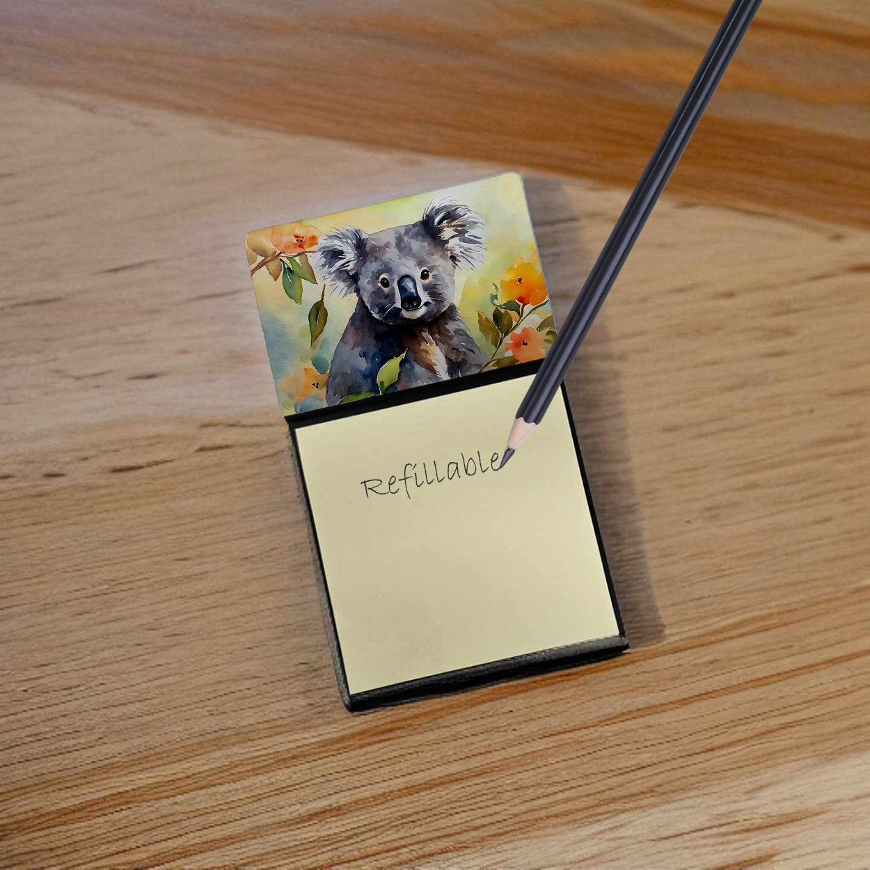 Sticky Note Holder featuring breed specific Koala artwork. Add a touch of creativity and flair to your desk with the Decorative Sticky Note Holder from Caroline's Treasures. This uniquely designed sticky note dispenser will not only keep your notes in one place but also add an artistic element to your workspace. The top of the holder features beautiful artwork that is sure to catch the eye. Crafted for convenience, this sticky note holder comes with a small pad of 3-inch x 3-inch sticky notes at the bottom. The holder is designed for easy refilling; simply remove the last sheet of a new sticky note pad and stick it onto the board. This feature ensures you will always have sticky notes at your disposal. This Sticky Note Holder makes a perfect gift. Be it for your colleagues at work, your Facebook friends, or even your dog groomer or hairdresser, this versatile product fits the bill. You can use it for making grocery lists, leaving notes for loved ones, or for jotting down important reminders. The bottom board is rigid and can be magnetized by adding a business card size magnet to the back (sold separately). This makes it even more versatile, allowing you to place it on a refrigerator or any other magnetic surface. With this Sticky Note Holder, you're not only organizing your notes, but also personalizing your space.