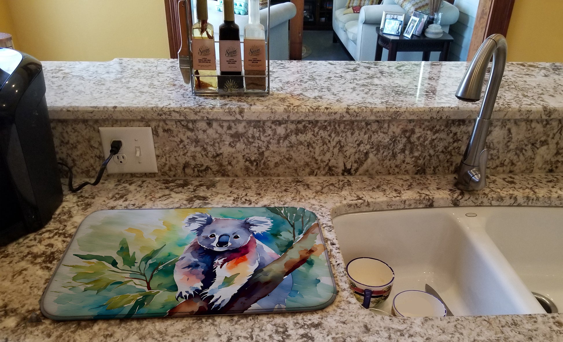 Dish Drying Mat featuring breed specific Koala artwork. Say goodbye to messy countertops and soggy dish towels with our innovative dish drying mat. Our high-quality dish drying pad is designed to keep your countertops dry while offering a stylish and efficient solution. Whether you're air drying dishes, glasses, stemware, silverware, pots, pans, bottles, or even fruits and vegetables, our dish mat is the perfect choice. The 14 inches x 22 inches size fits most counters and dish drying racks, and the non-slip design ensures stability. Made with water-absorbent polyester and a polyurethane foam insert, our dish drying mat is not only functional but also durable. It's machine washable and printed in the USA for long-lasting use. The beautiful artwork adds flair to your kitchen decor, making it a perfect housewarming gift or present for any occasion. Upgrade your kitchen experience with our absorbent and versatile dish drying mat.