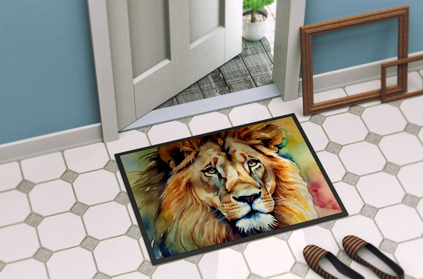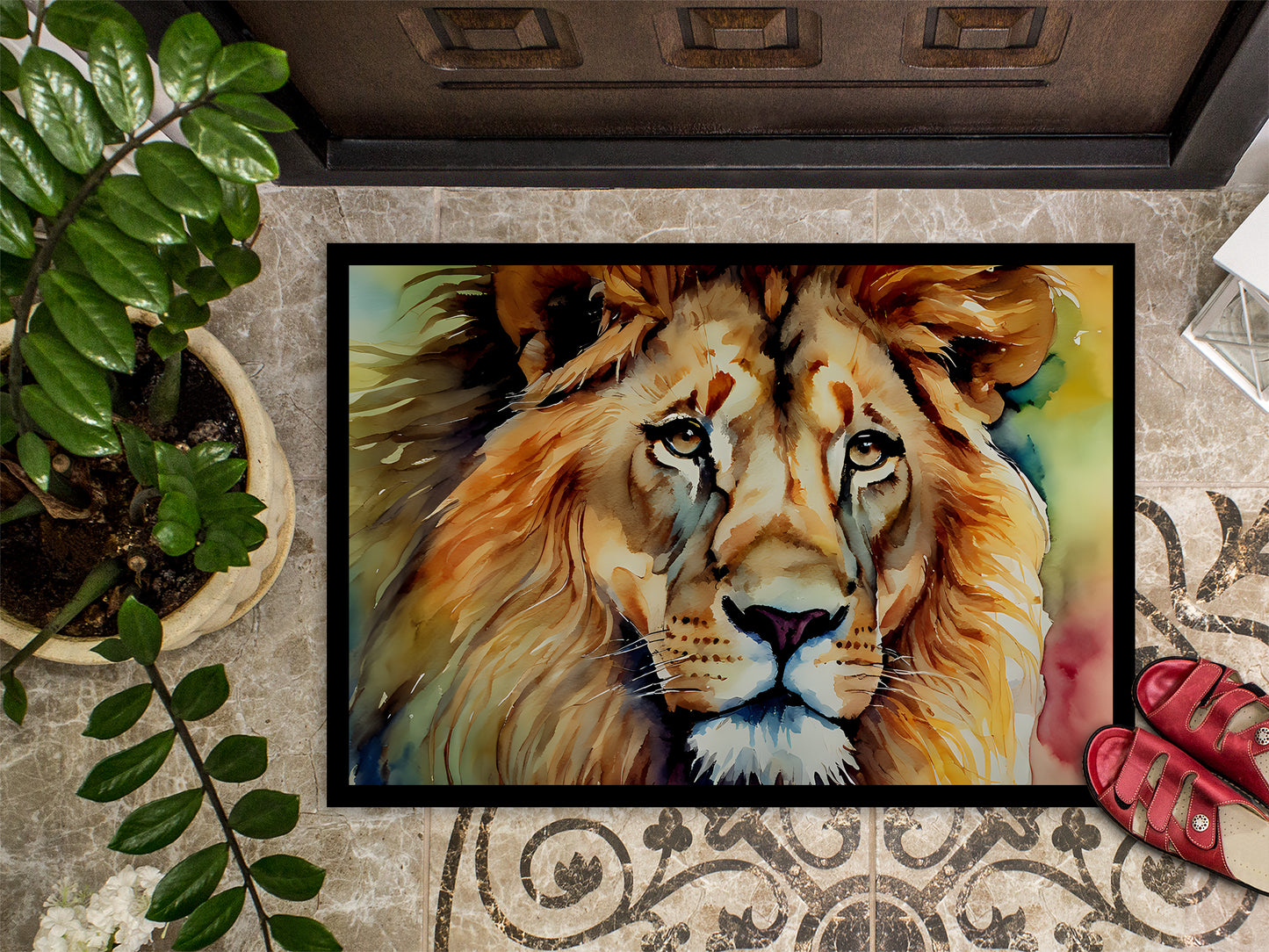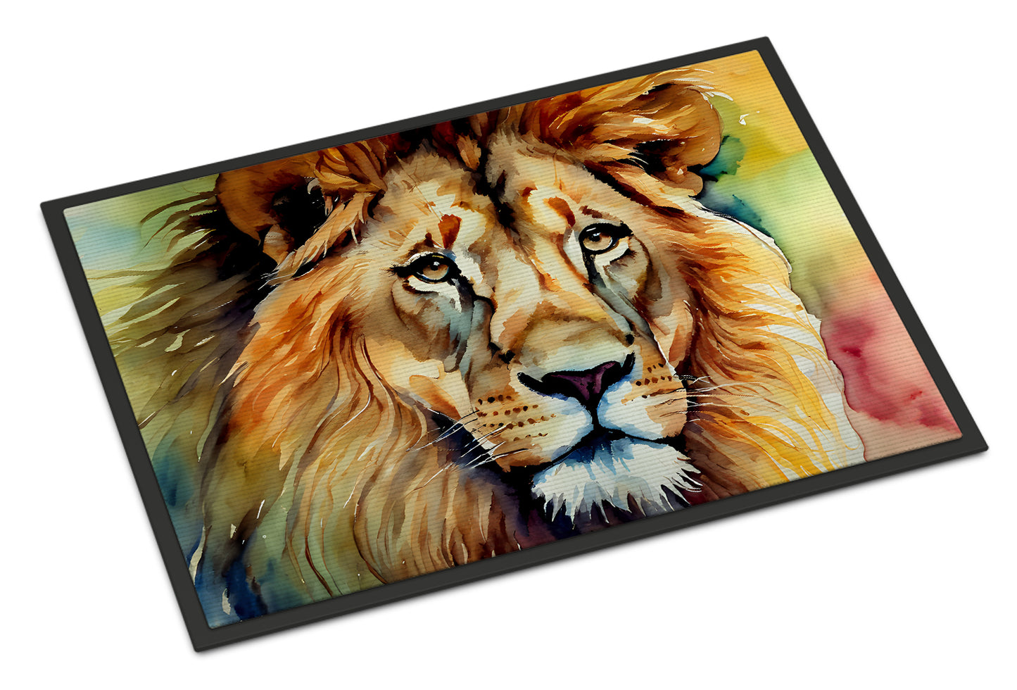 Doormat featuring breed specific Lion artwork. Welcome your guests in style with our Artwork Door Mat, designed to withstand almost any weather condition. This mat, measuring approximately 18 by 27 inches, is held together by durable black binding tape. Its top layer, composed of polyester felt, is dyed with the eye-catching image you see on the mat. A few layers below provide the mat with stability, while its rubber bottom is stamped to help prevent slipping and ensures safety. Our mat works wonderfully as both an indoor or outdoor door mat. For cleaning, simply hose it off with water or use a power washer - no need for any cleaner that produces suds. Avoid scrubbing with a brush, instead, opt for the vacuum on floor setting. Designed manufactured and printed in the USA, this mat is a perfect addition to your porch, outdoor kitchen, entryway, or any indoor space. Its unique design makes it a charming decorative rug that greets your guests and adds a stylish touch to your home decor.