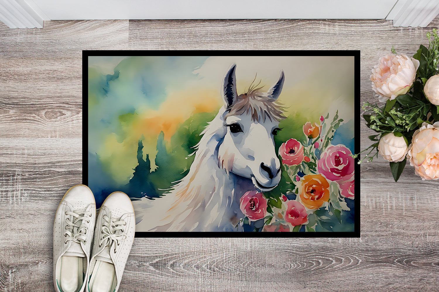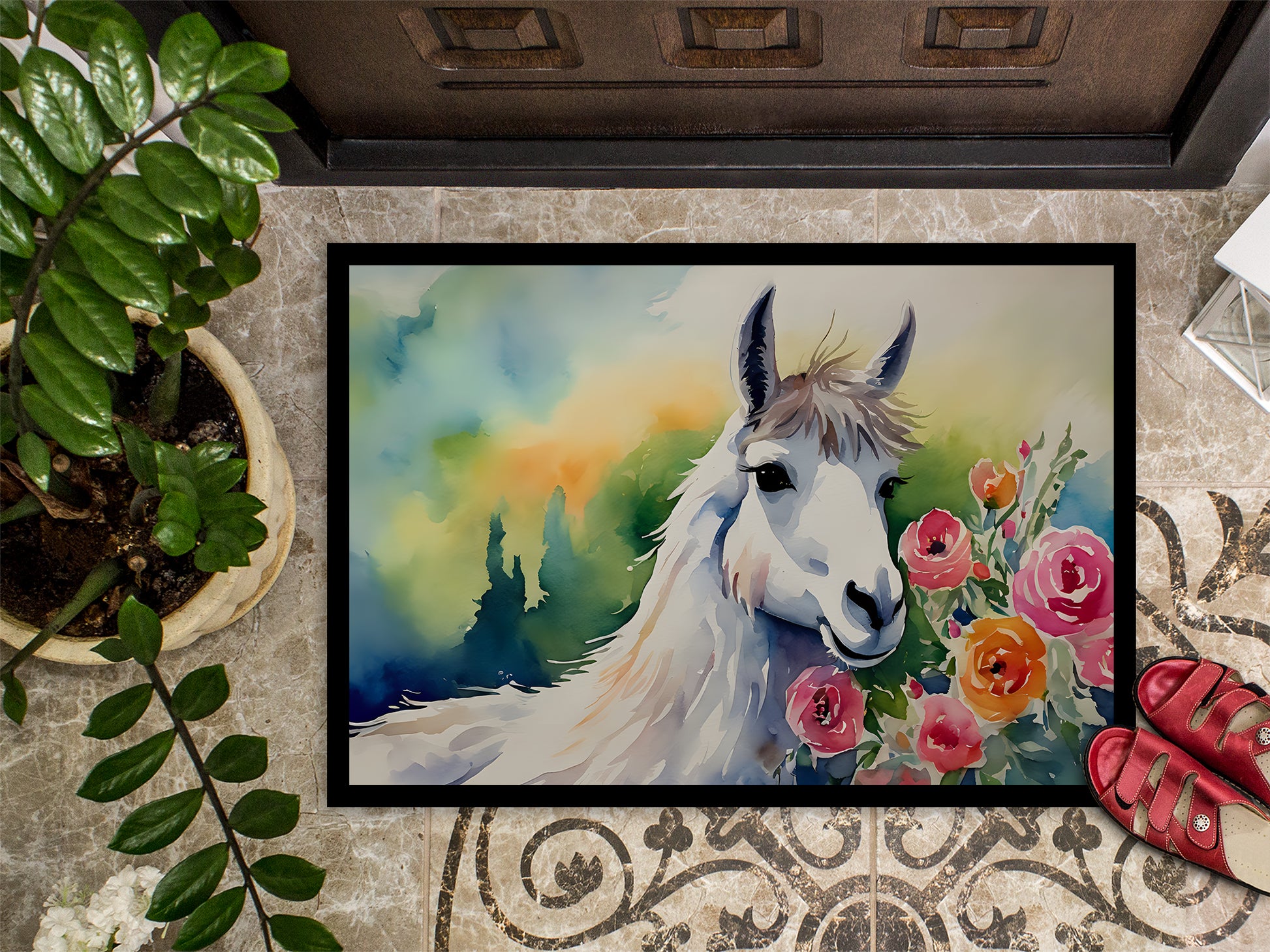 Doormat featuring breed specific Llama artwork. Welcome your guests in style with our Artwork Door Mat, designed to withstand almost any weather condition. This mat, measuring approximately 24 by 36 inches, is held together by durable black binding tape. Its top layer, composed of polyester felt, is dyed with the eye-catching image you see on the mat. A few layers below provide the mat with stability, while its rubber bottom is stamped to help prevent slipping and ensures safety. Our mat works wonderfully as both an indoor or outdoor door mat. For cleaning, simply hose it off with water or use a power washer - no need for any cleaner that produces suds. Avoid scrubbing with a brush, instead, opt for the vacuum on floor setting. Designed manufactured and printed in the USA, this mat is a perfect addition to your porch, outdoor kitchen, entryway, or any indoor space. Its unique design makes it a charming decorative rug that greets your guests and adds a stylish touch to your home decor.