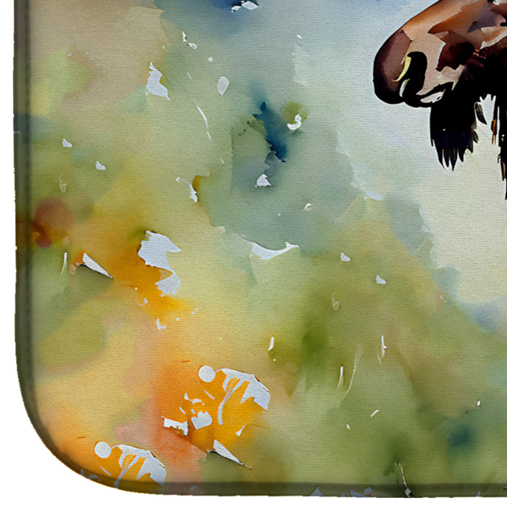Dish Drying Mat featuring breed specific Moose artwork. Say goodbye to messy countertops and soggy dish towels with our innovative dish drying mat. Our high-quality dish drying pad is designed to keep your countertops dry while offering a stylish and efficient solution. Whether you're air drying dishes, glasses, stemware, silverware, pots, pans, bottles, or even fruits and vegetables, our dish mat is the perfect choice. The 14 inches x 22 inches size fits most counters and dish drying racks, and the non-slip design ensures stability. Made with water-absorbent polyester and a polyurethane foam insert, our dish drying mat is not only functional but also durable. It's machine washable and printed in the USA for long-lasting use. The beautiful artwork adds flair to your kitchen decor, making it a perfect housewarming gift or present for any occasion. Upgrade your kitchen experience with our absorbent and versatile dish drying mat.