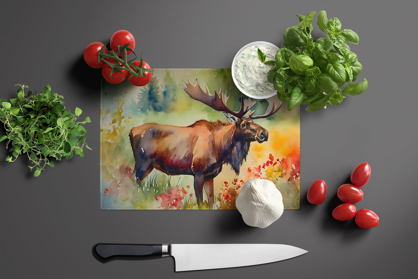 Glass Cutting Board featuring breed specific Moose artwork. Introduce your kitchen to the vibrant, large Decorative Glass Cutting Board from Caroline's Treasures. Crafted from resilient tempered glass, this board is not only a utilitarian necessity but also a colorful art piece. With its generous dimensions of 15 inches in height and 12 inches in length, it offers ample space for all your cutting needs. Every piece showcases captivating artwork from distinguished artists, bringing an aesthetic edge to your kitchen. Beyond its attractive design, this cutting board ensures your countertop stays pristine and unscathed, owing to its heat-resistant properties. Engineered with user convenience in mind, it features non-skid feet for stability, and rounded corners for additional safety. Its robust construction renders it virtually unbreakable, guaranteeing longevity. The board comes with protective feet bumpers, maintaining its position during use. This product is recommended to be hand washed only. Proudly printed and assembled in the United States, this cutting board exemplifies superior craftsmanship. With Caroline's Treasures' Decorative Glass Cutting Board, you're investing in a blend of functionality and artistic flair.