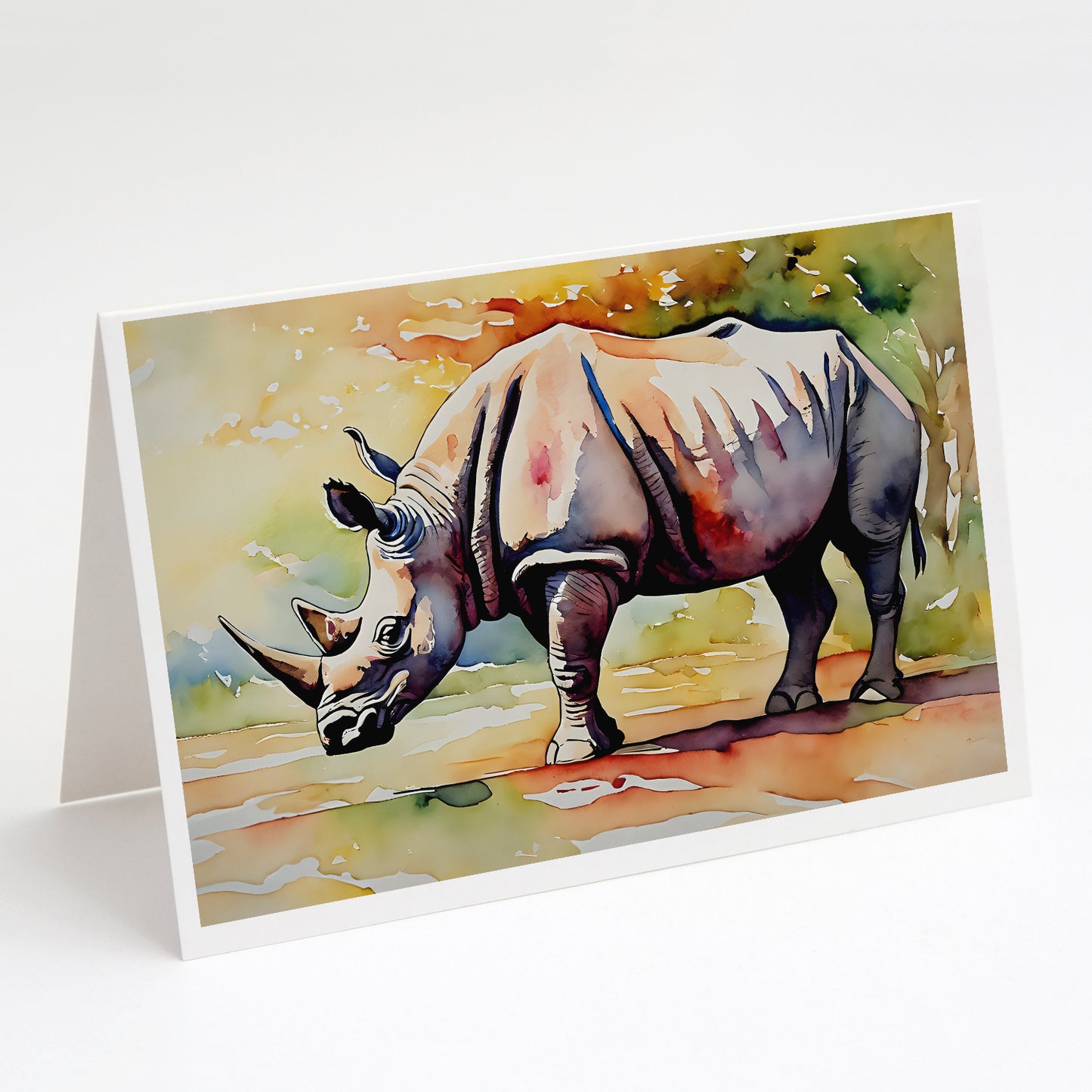 Greeting Cards Pack of 8 featuring breed specific Rhinoceros artwork. Celebrate special moments with Caroline's Treasures Printed Greeting Card Pack. This pack includes eight beautifully folded 5x7 cards, accompanied by eight matching white envelopes. With blank interiors, these cards provide ample space for your personalized messages and heartfelt holiday greetings. Each card features captivating full-color artwork, meticulously printed in our facility on high-quality 80 lb cover stock or 216 GSM. The super smooth finish of the white cards enhances the visual impact of the artwork, creating a truly stunning presentation. Designed by our talented in-house artists or licensed artists, the artwork on these cards showcases their creativity and attention to detail. From vibrant illustrations to captivating designs, each card tells its own unique story. Whether it's for birthdays, anniversaries, holidays, or any special occasion, Caroline's Treasures Greeting Card Pack is the perfect way to convey your heartfelt sentiments. Share joy, love, and warm wishes with these exquisite cards and make every moment unforgettable.
