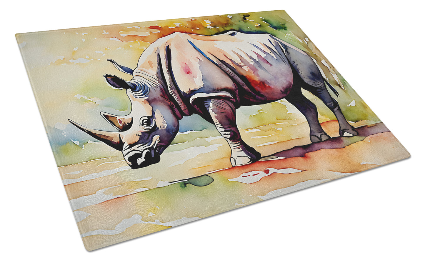 Glass Cutting Board featuring breed specific Rhinoceros artwork. Introduce your kitchen to the vibrant, large Decorative Glass Cutting Board from Caroline's Treasures. Crafted from resilient tempered glass, this board is not only a utilitarian necessity but also a colorful art piece. With its generous dimensions of 15 inches in height and 12 inches in length, it offers ample space for all your cutting needs. Every piece showcases captivating artwork from distinguished artists, bringing an aesthetic edge to your kitchen. Beyond its attractive design, this cutting board ensures your countertop stays pristine and unscathed, owing to its heat-resistant properties. Engineered with user convenience in mind, it features non-skid feet for stability, and rounded corners for additional safety. Its robust construction renders it virtually unbreakable, guaranteeing longevity. The board comes with protective feet bumpers, maintaining its position during use. This product is recommended to be hand washed only. Proudly printed and assembled in the United States, this cutting board exemplifies superior craftsmanship. With Caroline's Treasures' Decorative Glass Cutting Board, you're investing in a blend of functionality and artistic flair.